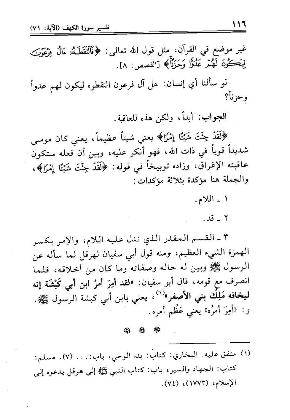 (لَقَدْ جِئْتَ شَيْئاً إِمْراً) يعني شيئاً عظيماً، يعني كان موسى شديداً قوياً في ذات الله، فهو أنكر عليه، وبين أن فعله ستكون عاقبته الإغراق، وزاده توبيخاً في قوله: (لَقَدْ جِئْتَ شَيْئاً إِمْراً)، والجملة هنا مؤكدة بثلاثة مؤكدات: