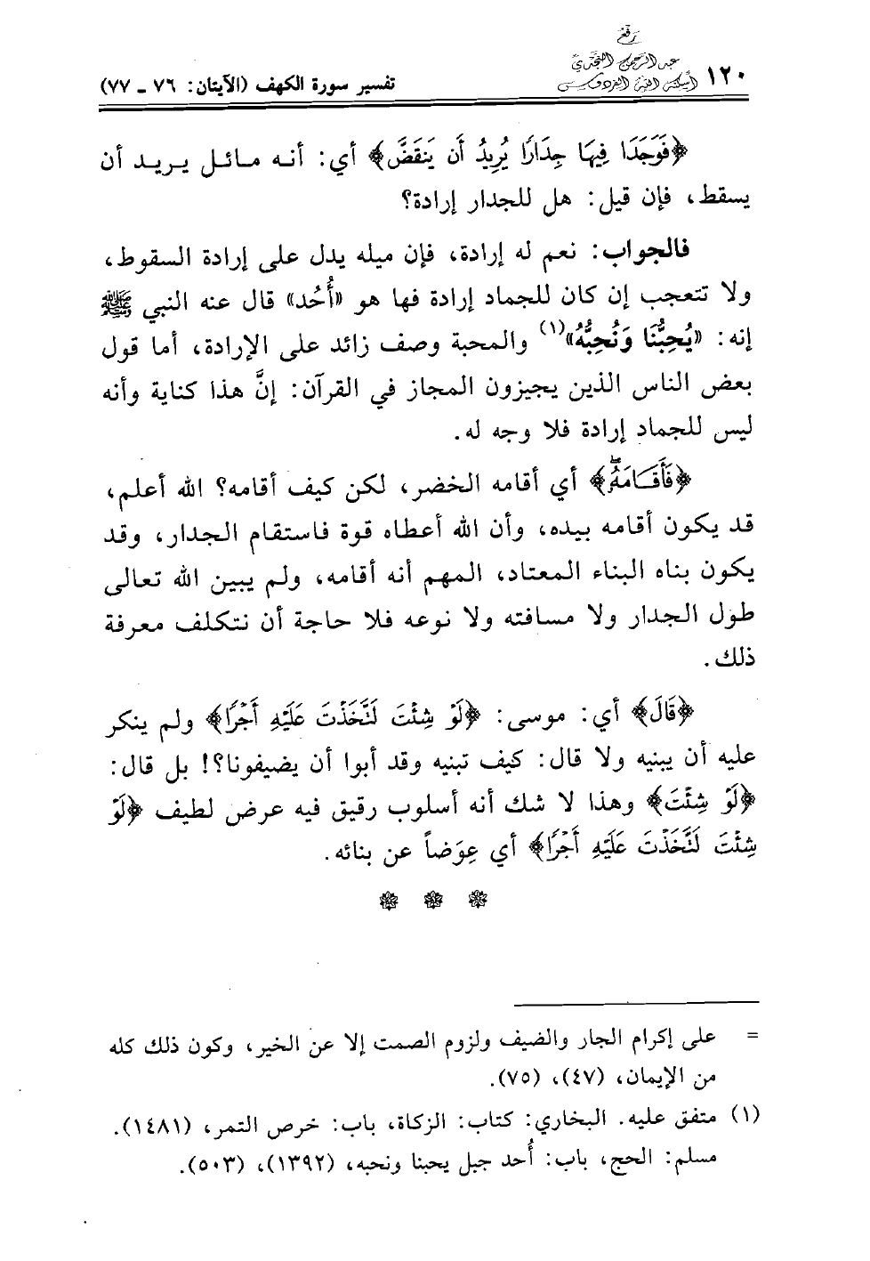 (فَأَقَامَهُ) أي أقامه الخضر، لكن كيف أقامه؟ الله أعلم، قد يكون أقامه بيده، وأن الله أعطاه قوة فاستقام الجدار، وقد يكون بناه البناء المعتاد، المهم أنه أقامه، ولم يبين الله تعالى طول الجدار ولا مسافته ولا نوعه فلا حاجة أن نتكلف معرفة ذلك.
