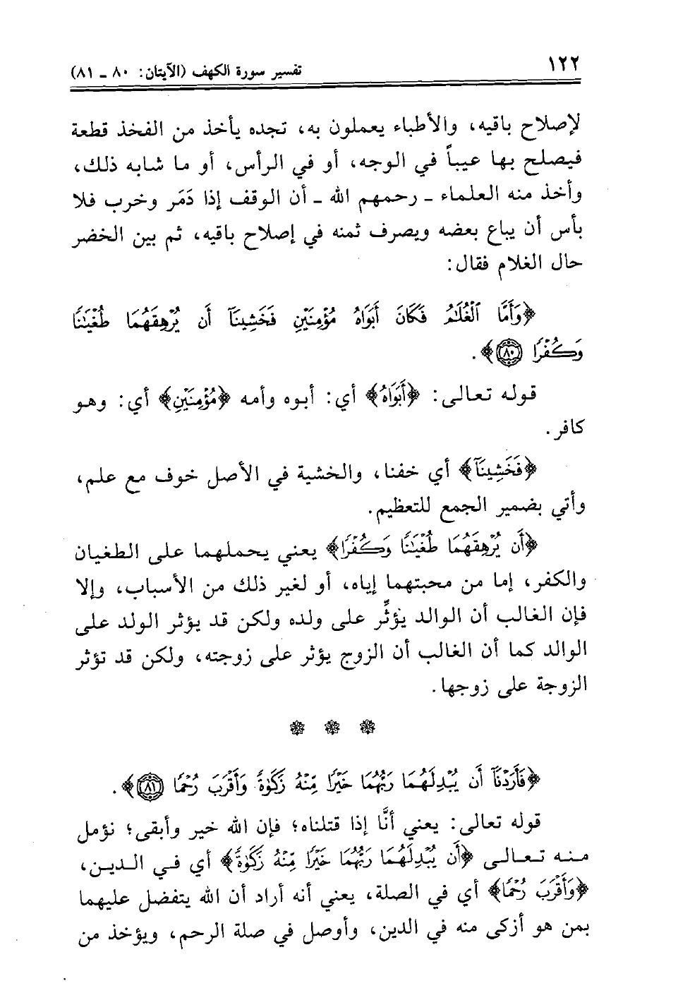 (أَنْ يُرْهِقَهُمَا طُغْيَاناً وَكُفْراً) يعني يحملهما على الطغيان والكفر، إما من محبتهما إياه، أو لغير ذلك من الأسباب، وإلا فإن الغالب أن الوالد يؤثِّر على ولده ولكن قد يؤثر الولد على الوالد كما أن الغالب أن الزوج يؤثر على زوجته، ولكن قد تؤثر الزوجة على زوجها.