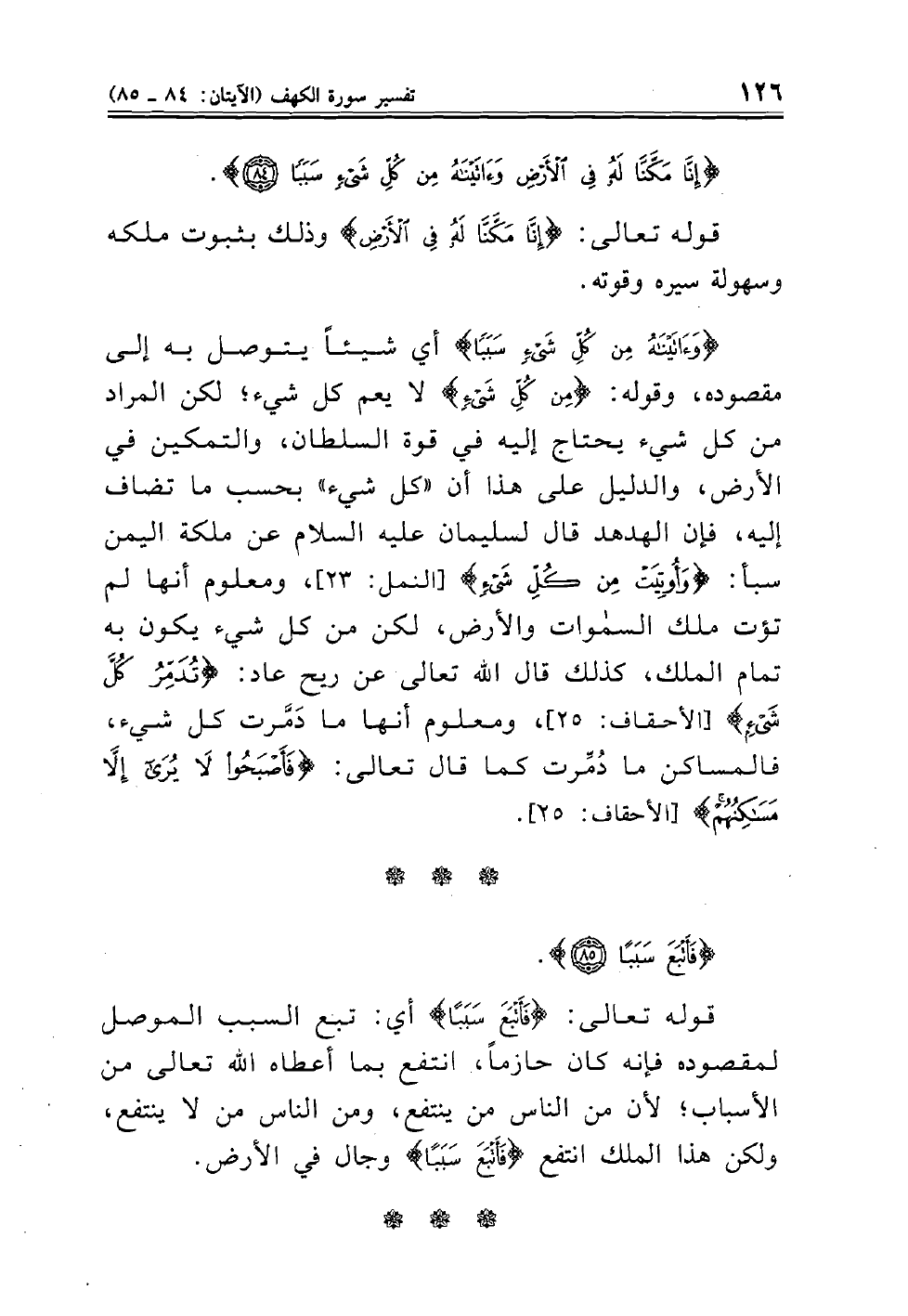 (وَآتَيْنَاهُ مِنْ كُلِّ شَيْءٍ سَبَباً) أي شيئاً يتوصل به إلى مقصوده، وقوله: (من كل شيء) لا يعم كل شيء؛ لكن المراد من كل شيء يحتاج إليه في قوة السلطان، والتمكين في الأرض، والدليل على هذا أن "كل شيء" بحسب ما تضاف إليه، فإن الهدهد قال لسليمان عليه السلام عن ملكة اليمن سبأ: (وأوتيت من كل شئ) (النمل: ٢٣)، ومعلوم أنها لم تؤت ملك السموات والأرض، لكن من كل شيء يكون به تمام الملك، كذلك قال الله تعالى عن ريح عاد: (تدمر كل شئ) (الأحقاف: ٢٥)، ومعلوم أنها ما دَمَّرت كل شيء، فالمساكن ما دُمِّرت كما قال تعالى: (فَأَصْبَحُوا لا يُرَى إِلَاّ مَسَاكِنُهُمْ) (الاحقاف: الآية ٢٥)