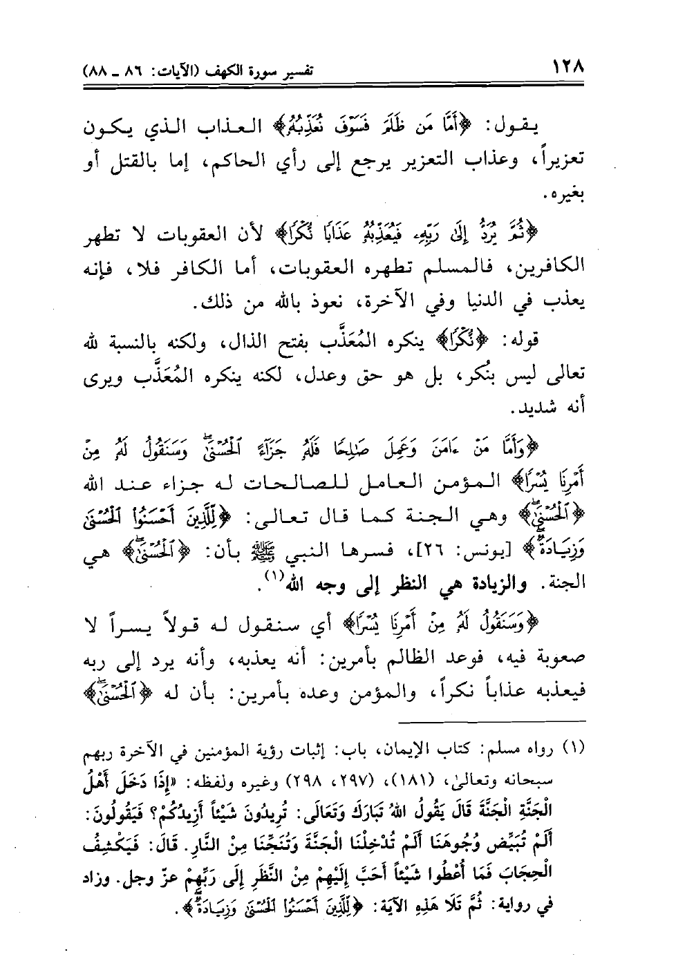 (¬١) رواه مسلم: كتاب الإيمان، باب: إثبات رؤية المؤمنين في الآخرة ربهم سبحانه وتعالى، (١٨١)، (٢٩٧، ٢٩٨) وغيره ولفظه: "إذا دخل أهل الجنة الجنة قال يقول الله تبارك وتعالى: تريدون شيئاً أزيدكم؟ فيقولون: ألم تبيض وجوهنا ألم تدخلنا الجنة وتنجنا من النار. قال: فيكشف الحجاب فما أعطوا شيئا أحب إليهم من النظر إلى ربهم عز وجل. وزاد في رواية: ثم تلا هذه الآية: (لِلَّذِينَ أَحْسَنُوا الْحُسْنَى وَزِيَادَةٌ)