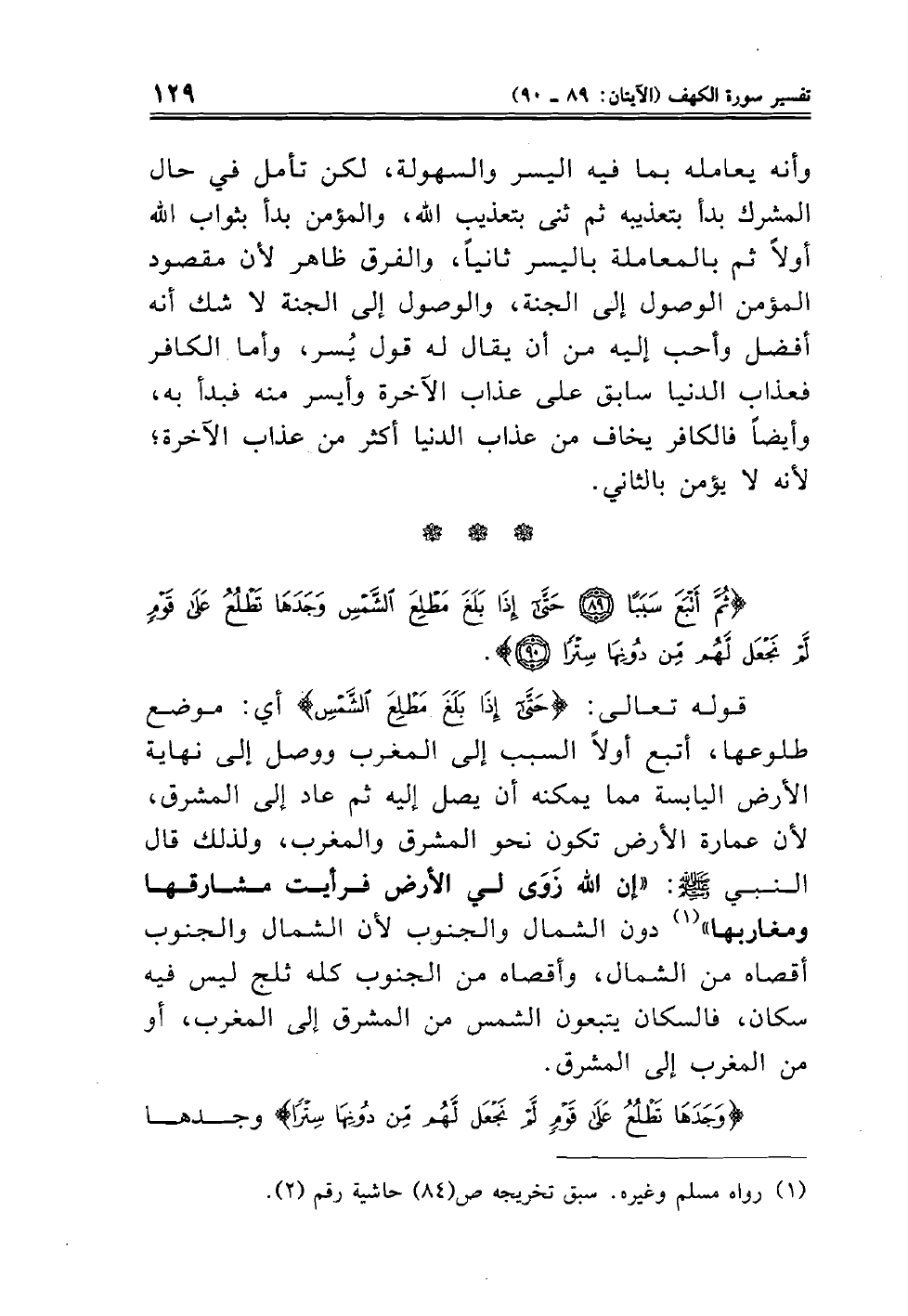 قوله تعالى: (حَتَّى إِذَا بَلَغَ مَطْلِعَ الشَّمْسِ) أي: موضع طلوعها، أتبع أولاً السبب إلى المغرب ووصل إلى نهاية الأرض اليابسة مما يمكنه أن يصل إليه ثم عاد إلى المشرق، لأن عمارة الأرض تكون نحو المشرق والمغرب، ولذلك قال النبي صلى الله عليه وسلم: "إن الله زَوَى لي الأرض فرأيت مشارقها ومغاربها" (¬١) دون الشمال والجنوب لأن الشمال والجنوب أقصاه من الشمال، وأقصاه من الجنوب كله ثلج ليس فيه سكان، فالسكان يتبعون الشمس من المشرق إلى المغرب، أو من المغرب إلى المشرق.