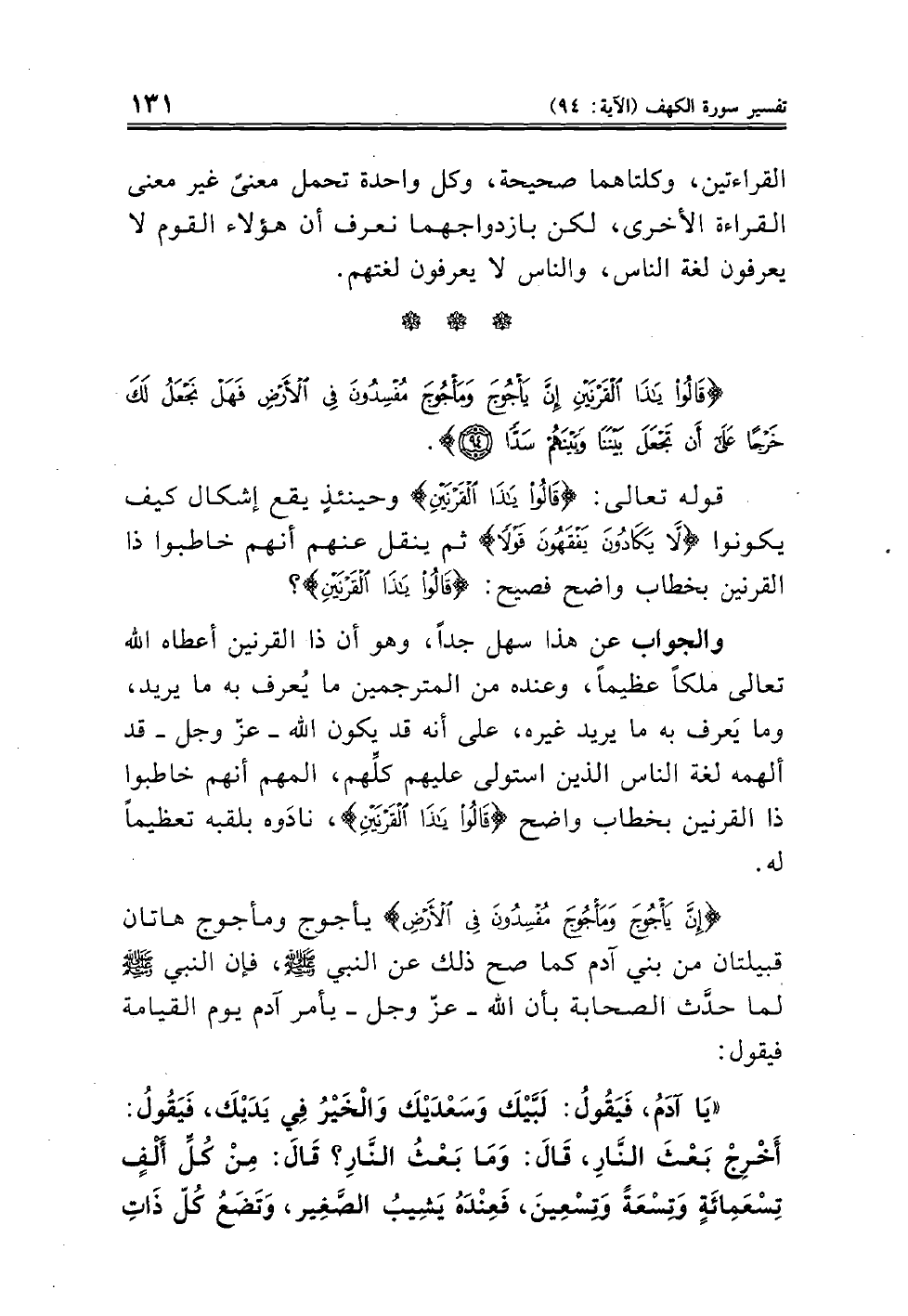 قوله تعالى: (قَالُوا يَا ذَا الْقَرْنَيْنِ) وحينئذٍ يقع إشكال كيف يكونوا (لا يَكَادُونَ يَفْقَهُونَ قَوْلاً) ثم ينقل عنهم أنهم خاطبوا ذا القرنين بخطاب واضح فصيح: ((قَالُوا يَا ذَا الْقَرْنَيْنِ)؟