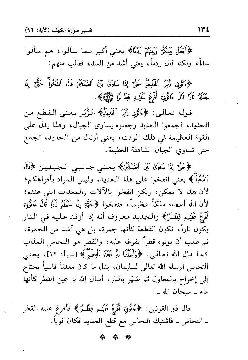 (حَتَّى إِذَا سَاوَى بَيْنَ الصَّدَفَيْنِ) يعني جانبي الجبلين (قَالَ انْفُخُوا) يعني انفخوا على هذا الحديد، وليس المراد بأفواهكم؛ لأن هذا لا يمكن، ولكن انفخوا بالآلات والمعدات التي عنده؛ لأن الله أعطاه ملكاً عظيماً، فنفخوا (حَتَّى إِذَا جَعَلَهُ نَاراً قَالَ آتُونِي أُفْرِغْ عَلَيْهِ قِطْراً) والحديد معروف أنه إذا أوقد عليه في النار يكون ناراً، تكون القطعة كأنها جمرة، بل هي أشد من الجمرة، ثم طلب أن يؤتوه قطراً يفرغه عليه، والقطر هو النحاس المذاب كما قال الله تعالى: (وَأَسَلْنَا لَهُ عَيْنَ الْقِطْر) (سبأ: الآية ١٢)، يعني النحاس أرسله الله تعالى لسليمان، بدل ما كان معدناً قاسياً يحتاج إلى إخراج بالمعاول ثم صَهْر بالنار، أسال الله له عين القطر كأنها ماء - سبحان الله -.