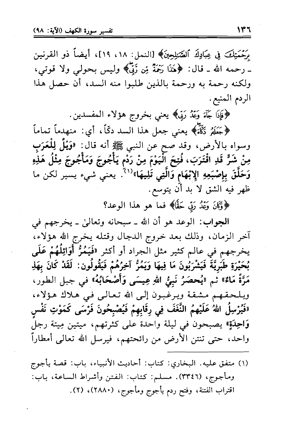 الجواب: الوعد هو أن الله سبحانه وتعالى يخرجهم في آخر الزمان، وذلك بعد خروج الدجال وقتله يخرج الله هؤلاء، يخرجهم في عالم كثير مثل الجراد أو أكثر "فَيَمُرُّ أَوَائِلُهُمْ عَلَى بُحَيْرَةِ طَبَرِيَّةَ فَيَشْرَبُونَ مَا فِيهَا وَيَمُرُّ آخِرُهُمْ فَيَقُولُون: لَقَدْ كَانَ بِهَذِ مَرَّةً مَاءٌ" ثم "يُحصَرُ نَبِيُّ اللهِ عِيسَى وَأَصْحَابُهُ" في جبل الطور، ويلحقهم مشقة ويرغبون إلى الله تعالى في هلاك هؤلاء، "فَيُرْسِلُ اللهُ عَلَيْهمُ النَّغَفَ فِي رِقَابِهِمْ فَيُصْبِحُونَ فَرْسَى كَمَوْتِ نَفْسٍ وَاحِدَةٍ" يصبحون في ليلة واحدة على كثرتهم، ميتين مِيتة رجل واحد، حتى تنتن الأرض من رائحتهم، فيرسل الله تعالى أمطاراً