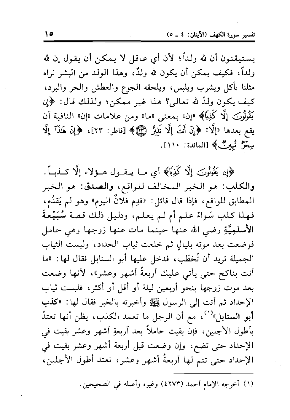 يستيقنون أن لله ولداً؛ لأن أي عاقل لا يمكن أن يقول إن لله ولداً، فكيف يمكن أن يكون لله ولدٌ، وهذا الولد من البشر نراه مثلنا يأكل ويشرب ويلبس، ويلحقه الجوع والعطش والحر والبرد، كيف يكون ولدٌ لله تعالى؟ هذا غير ممكن؛ ولذلك قال: (إِنْ يَقُولُونَ إِلَاّ كَذِباً) "إن" بمعنى "ما" ومن علامات "إن" النافية أن يقع بعدها "إلَاّ" (إن أنت إلا نذير) (فاطر: ٢٣)، (إن هذا إلا سحر مبين) (المائدة: ١١٠).