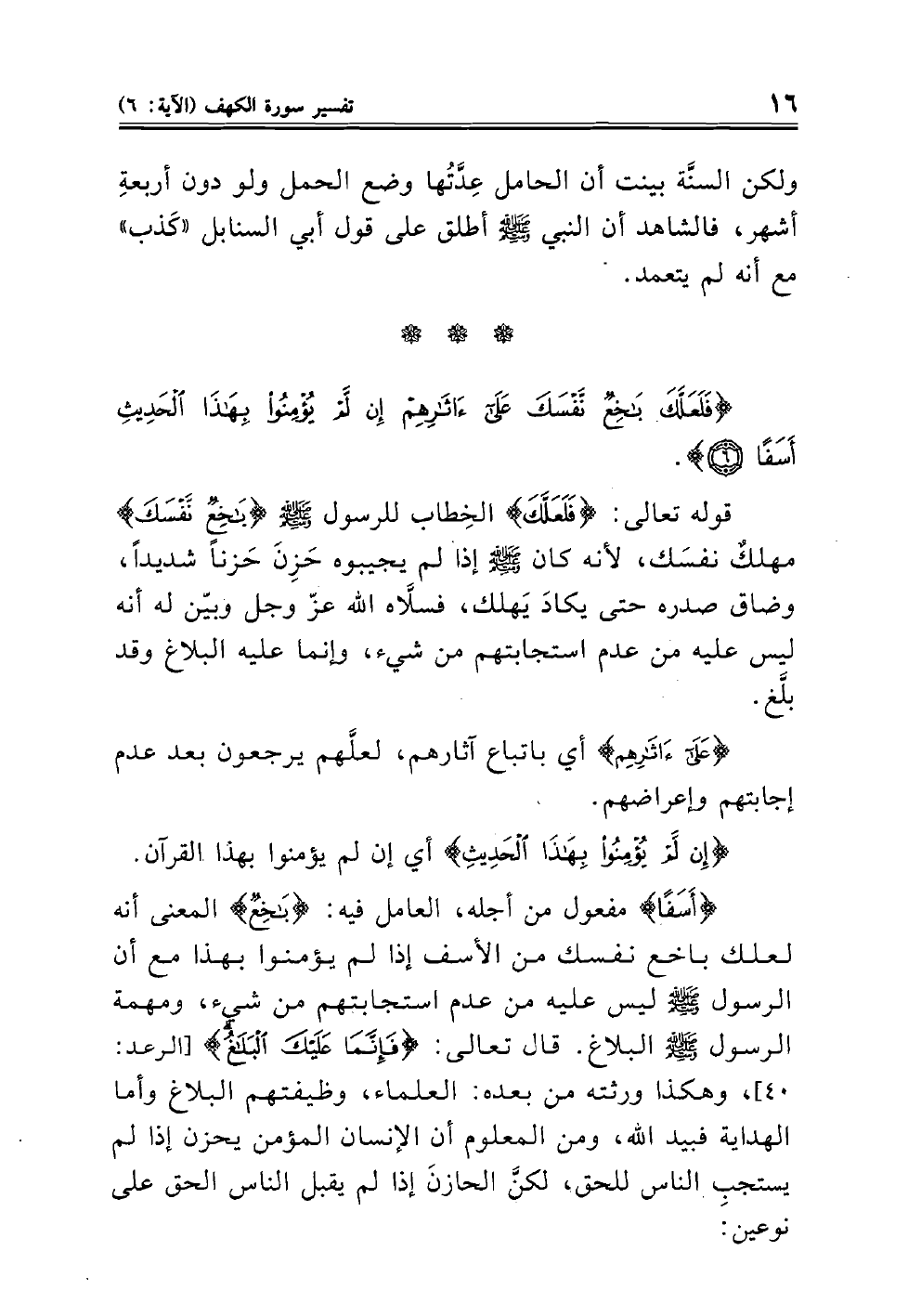 (أَسَفاً)) مفعول من أجله، العامل فيه: (بَاخِعٌ) المعنى أنه لعلك باخع نفسك من الأسف إذا لم يؤمنوا بهذا مع أن الرسول صلى الله عليه وسلم ليس عليه من عدم استجابتهم من شيء، ومهمة الرسول صلى الله عليه وسلم البلاغ،. قال تعالى: (فإنما عليك البلاغ) (الرعد: ٤٠)، وهكذا ورثته من بعده: العلماء، وظيفتهم البلاغ وأما الهداية فبيد الله، ومن المعلوم أن الإنسان المؤمن يحزن إذا لم يستجبِ الناس للحق، لكنَّ الحازنَ إذا لم يقبل الناس الحق على نوعين: