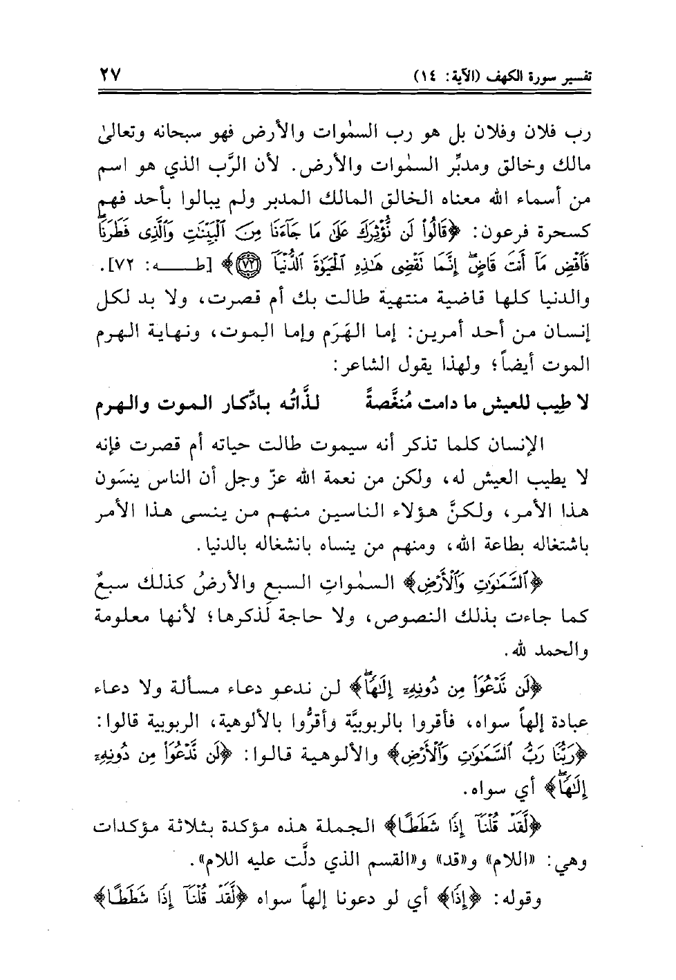 رب فلان وفلان بل هو رب السموات والأرض فهو سبحانه وتعالى مالك وخالق ومدبِّر السموات والأرض. لأن الرَّب الذي هو اسم من أسماء الله معناه الخالق المالك المدبر ولم يبالوا بأحد فهم كسحرة فرعون: (قَالُوا لَنْ نُؤْثِرَكَ عَلَى مَا جَاءَنَا مِنَ الْبَيِّنَاتِ وَالَّذِي فَطَرَنَا فَاقْضِ مَا أَنْتَ قَاضٍ إِنَّمَا تَقْضِي هَذِهِ الْحَيَاةَ الدُّنْيَا) (طه: ٧٢)