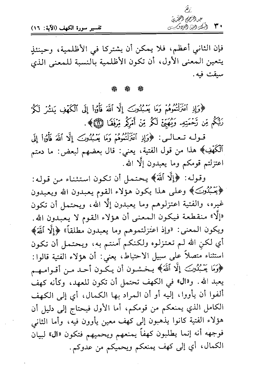 وقوله: (إِلَاّ اللَّهَ) يحتمل أن تكون استثناء من قوله: (يَعْبُدُون) وعلى هذا يكون هؤلاء القوم يعبدون الله ويعبدون غيره، والفتية اعتزلوهم وما يعبدون إلَاّ الله، ويحتمل أن تكون "إلَاّ" منقطعة فيكون المعنى أن هؤلاء القوم لا يعبدون الله. ويكون المعنى: "وإذ اعتزلتموهم وما يعبدون مطلقاً" (إِلَاّ اللَّهَ) أي لكنِ الله لم تعتزلوه ولكنكم آمنتم به، ويحتمل أن تكون استثناء متصلاً على سبيل الاحتياط، يعني: أن هؤلاء الفتية قالوا: (وَمَا يَعْبُدُونَ إِلَاّ اللَّهَ) يخشون أن يكون أحد من أقوامهم يعبد الله. و "ال" في الكهف تحتمل أن تكون للعهد، وكأنه كهف ألفوا أن يأووا، إليه أو أن المراد بها الكمال، أي إلى الكهف الكامل الذي يمنعكم من قومكم، أما الأول فيحتاج إلى دليل أن هؤلاء الفتية كانوا يذهبون إلى كهف معين يأوون فيه، وأما الثاني فوجهه أنه إنما يطلبون كهفاً يمنعهم ويحميهم فتكون "ال" لبيان الكمال، أي إلى كهف يمنعكم ويحميكم من عدوكم.