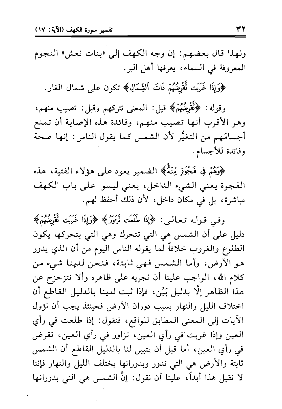 وفي قوله تعالى: (إِذَا طَلَعَتْ تَزَاوَرُ) (وَإِذَا غَرَبَتْ تَقْرِضُهُم) دليل على أن الشمس هي التي تتحرك وهي التي بتحركها يكون الطلوع والغروب خلافاً لما يقوله الناس اليوم من أن الذي يدور هو الأرض، وأما الشمس فهي ثابتة، فنحن لدينا شيء من كلام الله، الواجب علينا أن نجريه على ظاهره وألا نتزحزح عن هذا الظاهر إلَاّ بدليل بَيِّن، فإذا ثبت لدينا بالدليل القاطع أن اختلاف الليل والنهار بسبب دوران الأرض فحينئذ يجب أن نؤول الآيات إلى المعنى المطابق للواقع، فنقول: إذا طلعت في رأي العين وإذا غربت في رأي العين، تزاور في رأي العين، تقرض في رأي العين، أما قبل أن يتبين لنا بالدليل القاطع أن الشمس ثابتة والأرض هي التي تدور وبدورانها يختلف الليل والنهار فإننا لا نقبل هذا أبداً، علينا أن نقول: إنَّ الشمس هي التي بدورانها