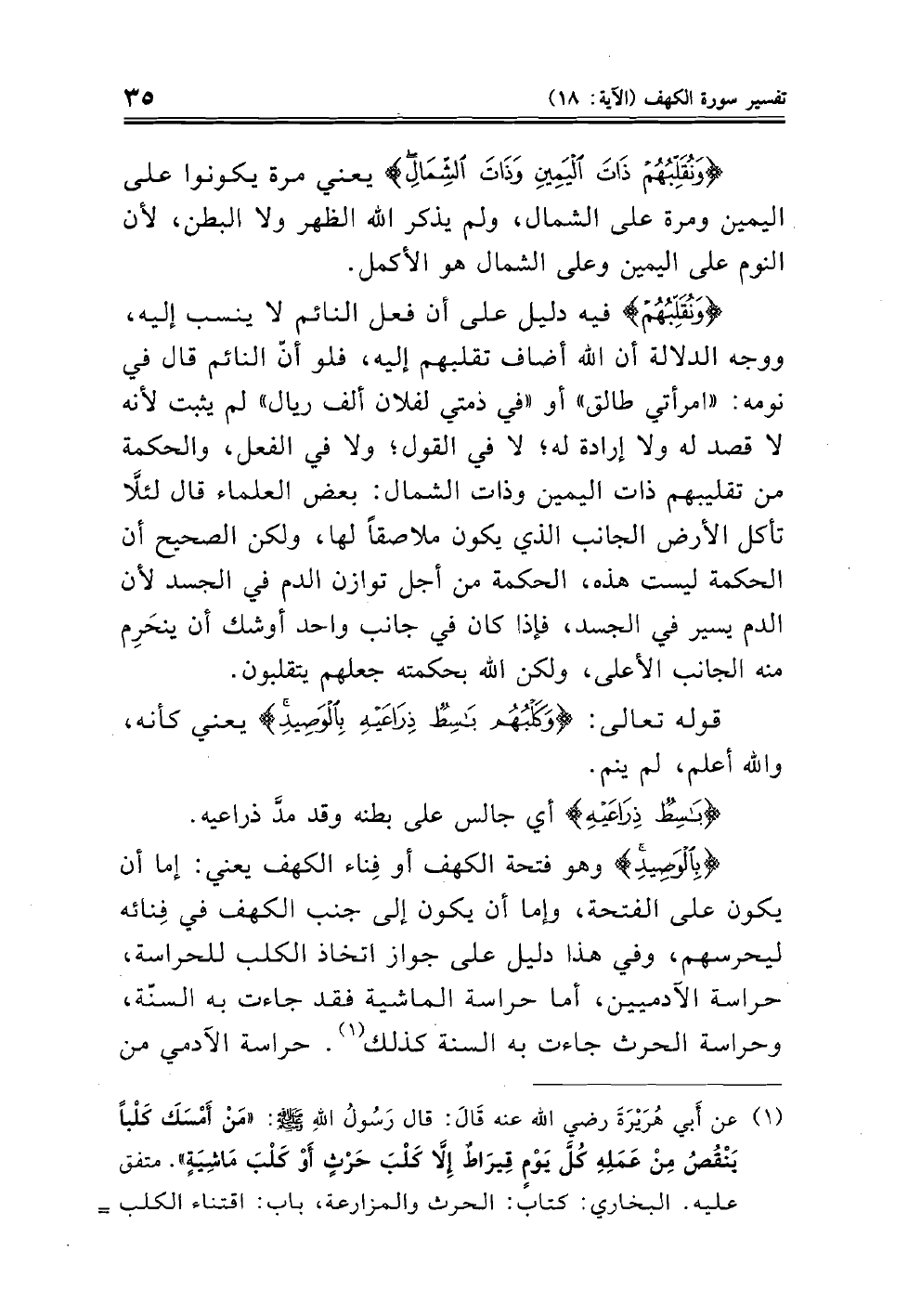 (وَنُقَلِّبُهُم) فيه دليل على أن فعل النائم لا ينسب إليه، ووجه الدلالة أن الله أضاف تقلبهم إليه، فلو أنّ النائم قال في نومه: "امرأتي طالق" أو "في ذمتي لفلان ألف ريال" لم يثبت لأنه لا قصد له ولا إرادة له؛ لا في القول؛ ولا في الفعل، والحكمة من تقليبهم ذات اليمين وذات الشمال: بعض العلماء قال لئلَاّ تأكل الأرض الجانب الذي يكون ملاصقاً لها، ولكن الصحيح أن الحكمة ليست هذه، الحكمة من أجل توازن الدم في الجسد لأن الدم يسير في الجسد، فإذا كان في جانب واحد أوشك أن ينحَرِم منه الجانب الأعلى، ولكن الله بحكمته جعلهم يتقلبون.