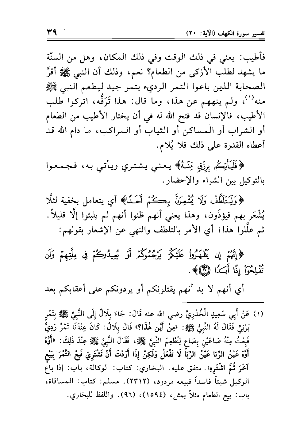 فأطيب: يعني في ذلك الوقت وفي ذلك المكان، وهل من السنّة ما يشهد لطلب الأزكى من الطعام؟ نعم، وذلك أن النبي صلى الله عليه وسلم أقرَّ الصحابة الذين باعوا التمر الرديء بتمر جيد ليطعم النبي صلى الله عليه وسلم منه، (¬١) ولم ينههم عن هذا، وما قال: هذا تَرَفُّه، اتركوا طلب الأطيب، فالإنسان قد فتح الله له في أن يختار الأطيب من الطعام أو الشراب أو المساكن أو الثياب أو المراكب، ما دام الله قد أعطاه القدرة على ذلك فلا يُلام.