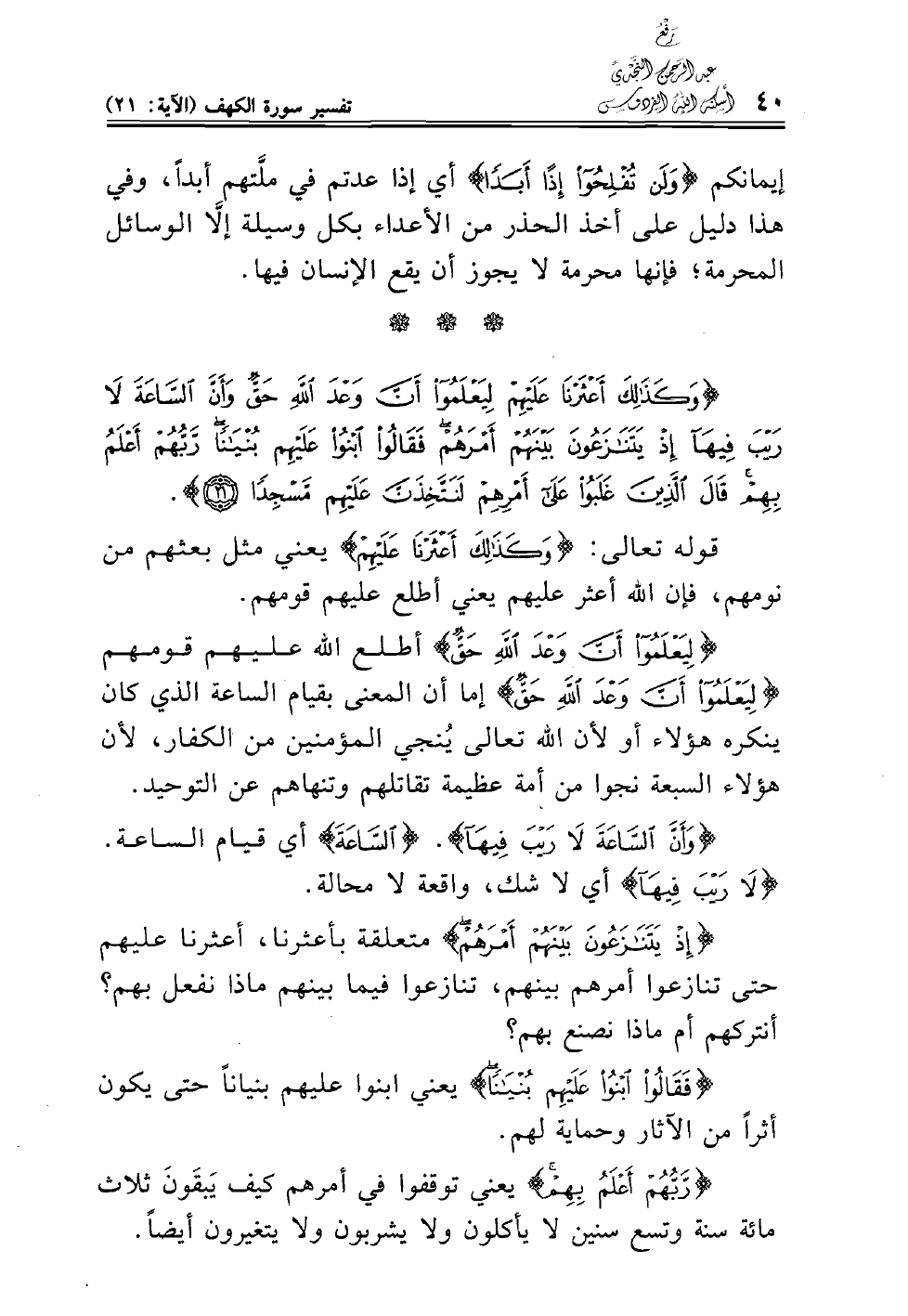 (لِيَعْلَمُوا أَنَّ وَعْدَ اللَّهِ حَقٌّ) أطلع الله عليهم قومهم (لِيَعْلَمُوا أَنَّ وَعْدَ اللَّهِ حَقٌّ) إما أن المعنى بقيام الساعة الذي كان ينكره هؤلاء أو لأن الله تعالى يُنجي المؤمنين من الكفار، لأن هؤلاء السبعة نجوا من أمة عظيمة تقاتلهم وتنهاهم عن التوحيد.
