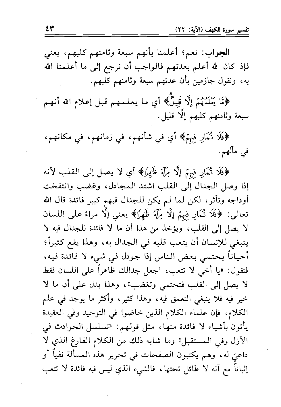 (فَلا تُمَارِ فِيهِمْ إِلَاّ مِرَاءً ظَاهِراً) أي لا يصل إلى القلب لأنه إذا وصل الجدال إلى القلب اشتد المجادل، وغضب وانتفخت أوداجه وتأثر، لكن لما لم يكن للجدال فيهم كبير فائدة قال الله تعالى: (فَلا تُمَارِ فِيهِمْ إِلَاّ مِرَاءً ظَاهِراً) يعني إلَاّ مراءً على اللسان لا يصل إلى القلب، ويؤخذ من هذا أن ما لا فائدة للجدال فيه لا ينبغي للإنسان أن يتعب قلبه في الجدال به، وهذا يقع كثيراً؛ أحياناً يحتمي بعض الناس إذا جودل في شيء لا فائدة فيه، فنقول: "يا أخي لا تتعب، اجعل جدالك ظاهراً على اللسان فقط لا يصل إلى القلب فتحتمي وتغضب"، وهذا يدل على أن ما لا خير فيه فلا ينبغي التعمق فيه، وهذا كثير، وأكثر ما يوجد في علم الكلام، فإن علماء الكلام الذين خاضوا في التوحيد وفي العقيدة يأتون بأشياء لا فائدة منها، مثل قولهم: "تسلسل الحوادث في الأزل وفي المستقبل" وما شابه ذلك من الكلام الفارغ الذي لا داعيَ له، وهم يكتبون الصفحات في تحرير هذه المسألة نفياً أو إثباتاً مع أنه لا طائل تحتها، فالشيء الذي ليس فيه فائدة لا تتعب