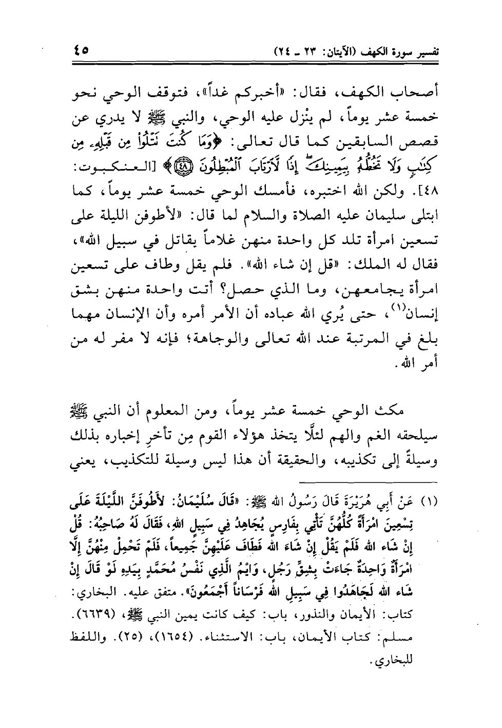 أصحاب الكهف، فقال: "أخبركم غداً"، فتوقف الوحي نحو خمسة عشر يوماً، لم ينْزل عليه الوحي، والنبي صلى الله عليه وسلم لا يدري عن قصص السابقين كما قال تعالى: (وَمَا كُنْتَ تَتْلُو مِنْ قَبْلِهِ مِنْ كِتَابٍ وَلا تَخُطُّهُ بِيَمِينِكَ إِذاً لارْتَابَ الْمُبْطِلُونَ) (العنكبوت: ٤٨). ولكن الله اختبره، فأمسك الوحي خمسة عشر يوماً، كما ابتلى سليمان عليه الصلاة والسلام لما قال: "لأطوفن الليلة على تسعين امرأة تلد كل واحدة منهن غلاماً يقاتل في سبيل الله"، فقال له الملك: "قل إن شاء الله". فلم يقل وطاف على تسعين امرأة يجامعهن، وما الذي حصل؟ أتت واحدة منهن بشق إنسان (¬١)، حتى يُري الله عباده أن الأمر أمره وأن الإنسان مهما بلغ في المرتبة عند الله تعالى والوجاهة؛ فإنه لا مفر له من أمر الله.
