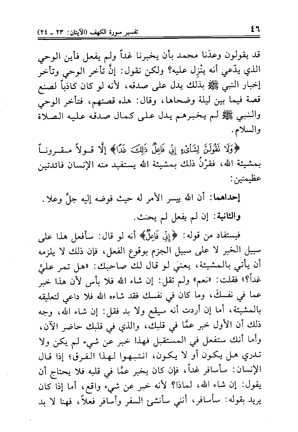 (وَلا تَقُولَنَّ لِشَيْءٍ إِنِّي فَاعِلٌ ذَلِكَ غَداً) إلَاّ قولاً مقروناً بمشيئة الله، فقرْنُ ذلك بمشيئة الله يستفيد منه الإنسان فائدتين عظيمتين: