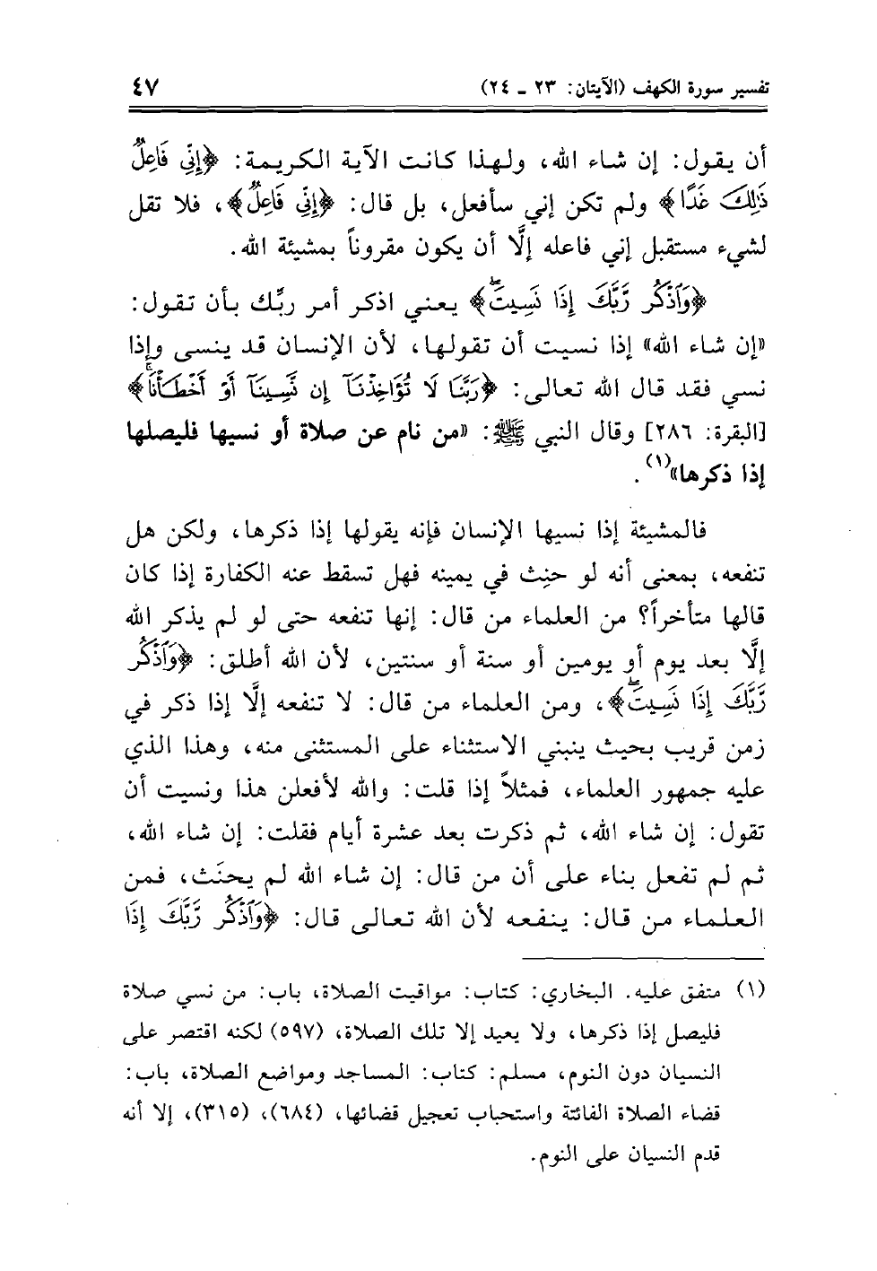 فالمشيئة إذا نسيها الإنسان فإنه يقولها إذا ذكرها، ولكن هل تنفعه، بمعنى أنه لو حنِث في يمينه فهل تسقط عنه الكفارة إذا كان قالها متأخراً؟ من العلماء من قال: إنها تنفعه حتى لو لم يذكر الله إلَاّ بعد يوم أو يومين أو سنة أو سنتين، لأن الله أطلق: (وَاذْكُرْ رَبَّكَ إِذَا نَسِيتَ)، ومن العلماء من قال: لا تنفعه إلَاّ إذا ذكر في زمن قريب بحيث ينبني الاستثناء على المستثنى منه، وهذا الذي عليه جمهور العلماء، فمثلاً إذا قلت: والله لأفعلن هذا ونسيت أن تقول: إن شاء الله، ثم ذكرت بعد عشرة أيام فقلت: إن شاء الله، ثم لم تفعل بناء على أن من قال: إن شاء الله لم يحنَث، فمن العلماء من قال: ينفعه لأن الله تعالى قال: (وَاذْكُرْ رَبَّكَ إِذَا