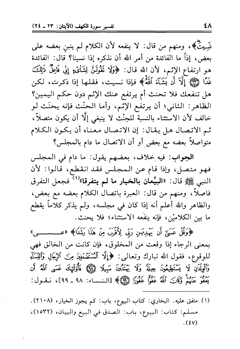 نَسِيتَ)، ومنهم من قال: لا ينفعه لأن الكلام لم ينبنِ بعضه على بعض، إذاً ما الفائدة من أمر الله أن نذكره إذا نسينا؟ قال: الفائدة هو ارتفاع الإثم، لأن الله قال: (وَلا تَقُولَنَّ لِشَيْءٍ إِنِّي فَاعِلٌ ذَلِكَ غَداً إِلَاّ أَنْ يَشَاءَ اللَّهُ) فإذا نسيت، فقلها إذا ذكرت، لكن هل تنفعك فلا تحنث أم يرتفع عنك الإثم دون حكم اليمين؟ الظاهر: الثاني؛ أن يرتفع الإثم، وأما الحنْث فإنه يحنَث لو خالف لأن الاستثناء بالنسبة للحِنْث لا ينبغي إلَاّ أن يكون متصلاً، ثم الاتصال هل يقال: إن الاتصال معناه أن يكون الكلام متواصلاً بعضه مع بعض أو أن الاتصال ما دام بالمجلس؟