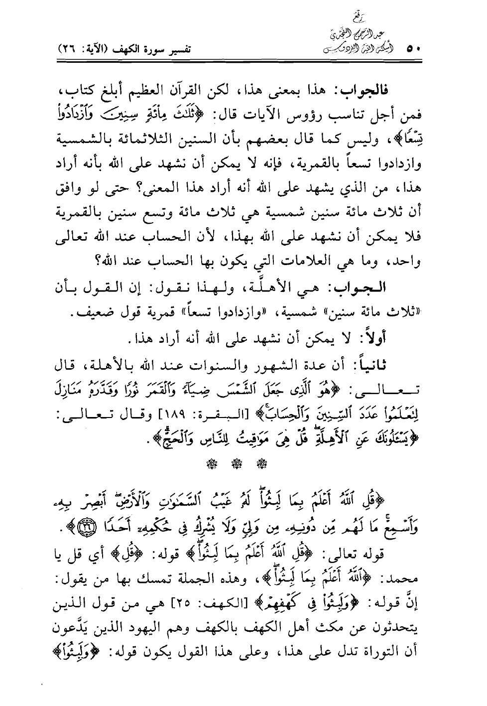 فالجواب: هذا بمعنى هذا، لكن القرآن العظيم أبلغ كتاب، فمن أجل تناسب رؤوس الآيات قال: (ثَلاثَ مِائَةٍ سِنِينَ وَازْدَادُوا تِسْعاً)، وليس كما قال بعضهم بأن السنين الثلاثمائة بالشمسية وازدادوا تسعاً بالقمرية، فإنه لا يمكن أن نشهد على الله بأنه أراد هذا، من الذي يشهد على الله أنه أراد هذا المعنى؟ حتى لو وافق أن ثلاث مائة سنين شمسية هي ثلاث مائة وتسع سنين بالقمرية فلا يمكن أن نشهد على الله بهذا، لأن الحساب عند الله تعالى واحد، وما هي العلامات التي يكون بها الحساب عند الله؟
