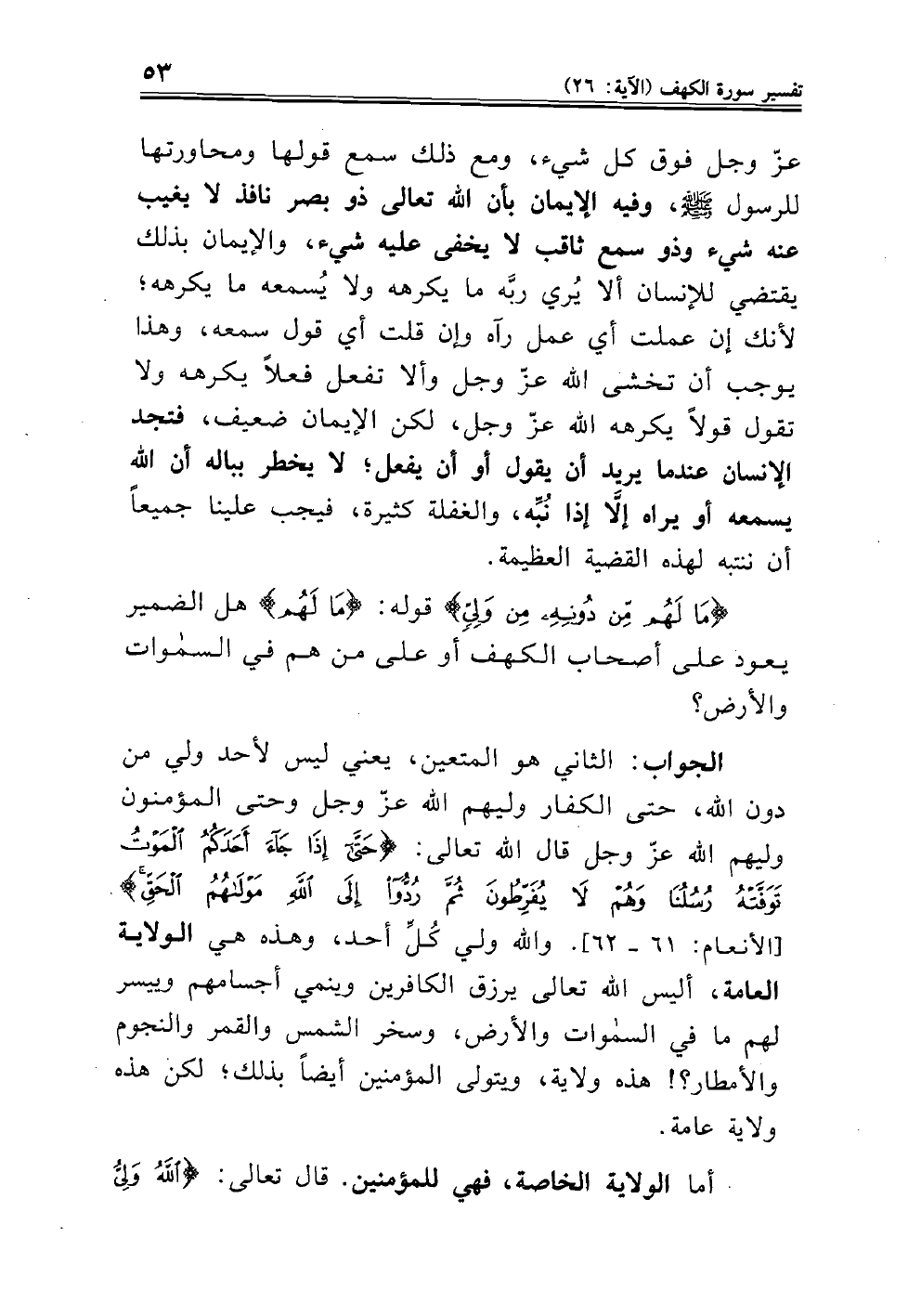 (مَا لَهُمْ مِنْ دُونِهِ مِنْ وَلِيٍّ) قوله: (مَا لَهُمْ) هل الضمير يعود على أصحاب الكهف أو على من هم في السموات والأرض؟