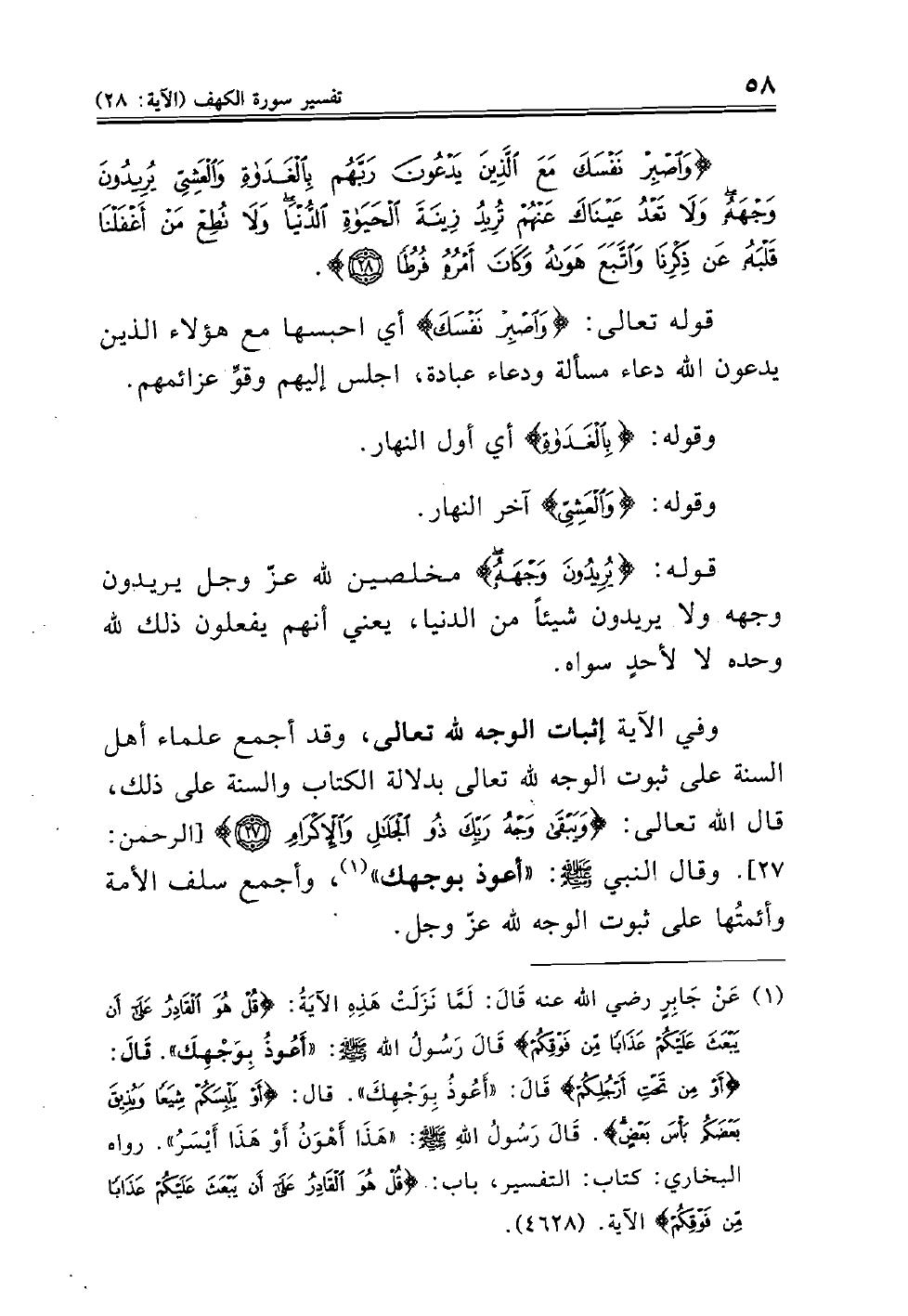 وفي الآية إثبات الوجه لله تعالى، وقد أجمع علماء أهل السنة على ثبوت الوجه لله تعالى بدلالة الكتاب والسنة على ذلك، قال الله تعالى: (وَيَبْقَى وَجْهُ رَبِّكَ ذُو الْجَلالِ وَالْأِكْرَامِ) (الرحمن: ٢٧). وقال النبي صلى الله عليه وسلم: "أعوذ بوجهك" (¬١)، وأجمع سلف الأمة وأئمتُها على ثبوت الوجه لله عز وجل.
