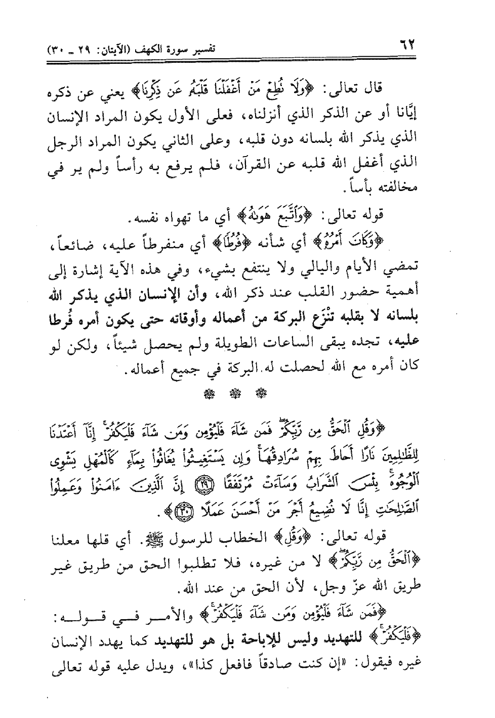 (وَكَانَ أَمْرُهُ) أي شأنه (فُرُطاً) أي منفرطاً عليه، ضائعاً، تمضي الأيام واليالي ولا ينتفع بشيء، وفي هذه الآية إشارة إلى أهمية حضور القلب عند ذكر الله، وأن الإنسان الذي يذكر الله بلسانه لا بقلبه تنْزَع البركة من أعماله وأوقاته حتى يكون أمره فُرطا عليه، تجده يبقى الساعات الطويلة ولم يحصل شيئاً، ولكن لو كان أمره مع الله لحصلت له البركة في جميع أعماله.