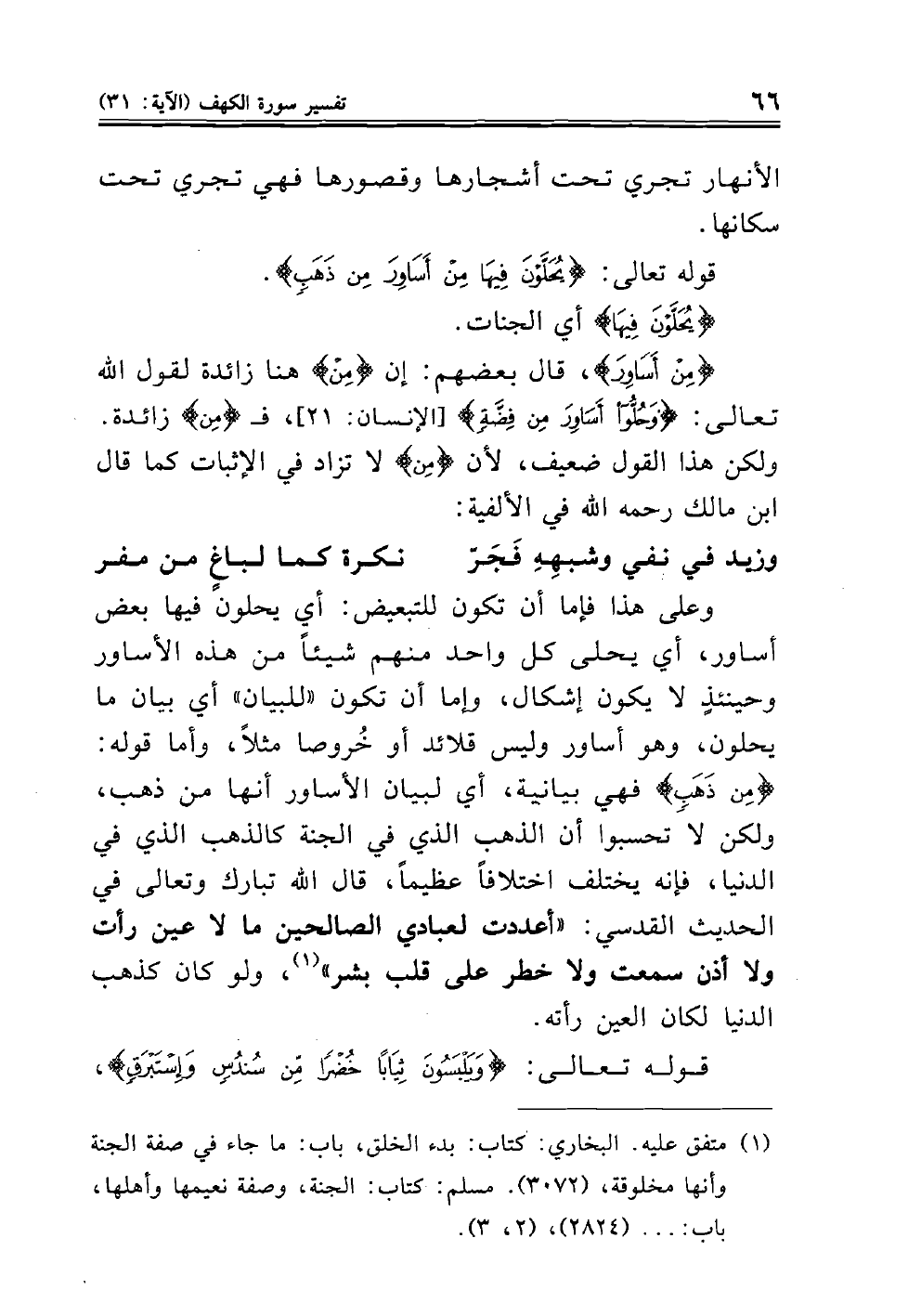(وزيد في نفي وشبهِهِ فَجَرّ نكرة كما لباغٍ من مفر) وعلى هذا فإما أن تكون للتبعيض: أي يحلون فيها بعض أساور، أي يحلى كل واحد منهم شيئاً من هذه الأساور وحينئذٍ لا يكون إشكال، وإما أن تكون "للبيان" أي بيان ما يحلون، وهو أساور وليس قلائد أو خُروصا مثلاً، وأما قوله: (مِنْ ذَهَبٍ) فهي بيانية، أي لبيان الأساور أنها من ذهب، ولكن لا تحسبوا أن الذهب الذي في الجنة كالذهب الذي في الدنيا، فإنه يختلف اختلافاً عظيماً، قال الله تبارك وتعالى في الحديث القدسي: "أعددت لعبادي الصالحين ما لا عين رأت ولا أذن سمعت ولا خطر على قلب بشر" (¬١)، ولو كان كذهب الدنيا لكان العين رأته.