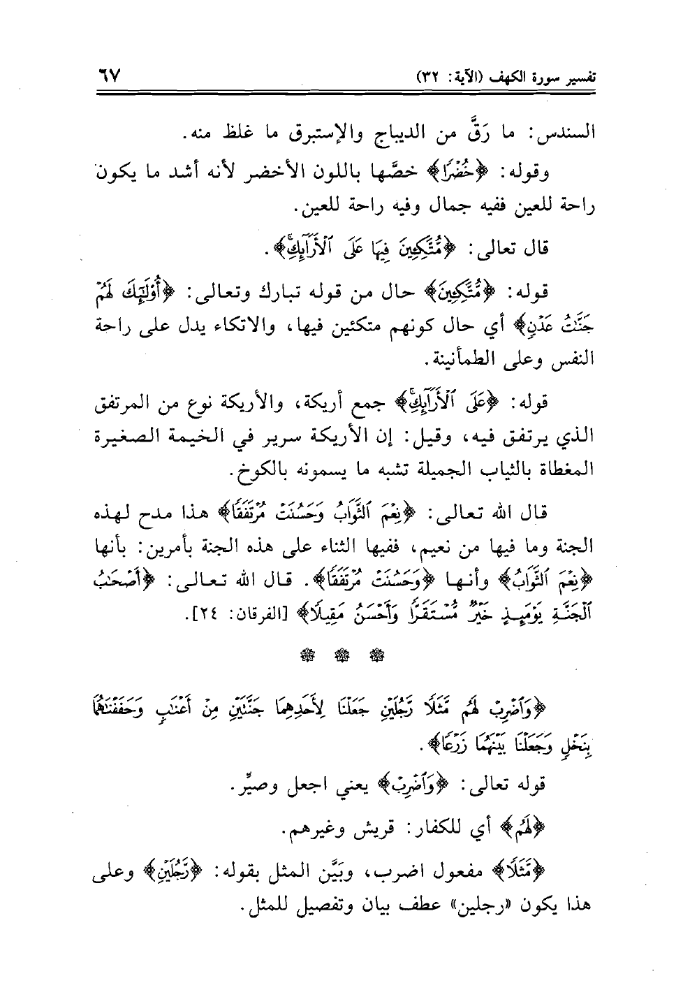 قال الله تعالى: (نِعْمَ الثَّوَابُ وَحَسُنَتْ مُرْتَفَقاً) هذا مدح لهذه الجنة وما فيها من نعيم، ففيها الثناء على هذه الجنة بأمرين: بأنها (نِعْمَ الثَّوَابُ) وأنها (وَحَسُنَتْ مُرْتَفَقاً). قال الله تعالى: (أَصْحَابُ الْجَنَّةِ يَوْمَئِذٍ خَيْرٌ مُسْتَقَرّاً وَأَحْسَنُ مَقِيلاً) (الفرقان: ٢٤)