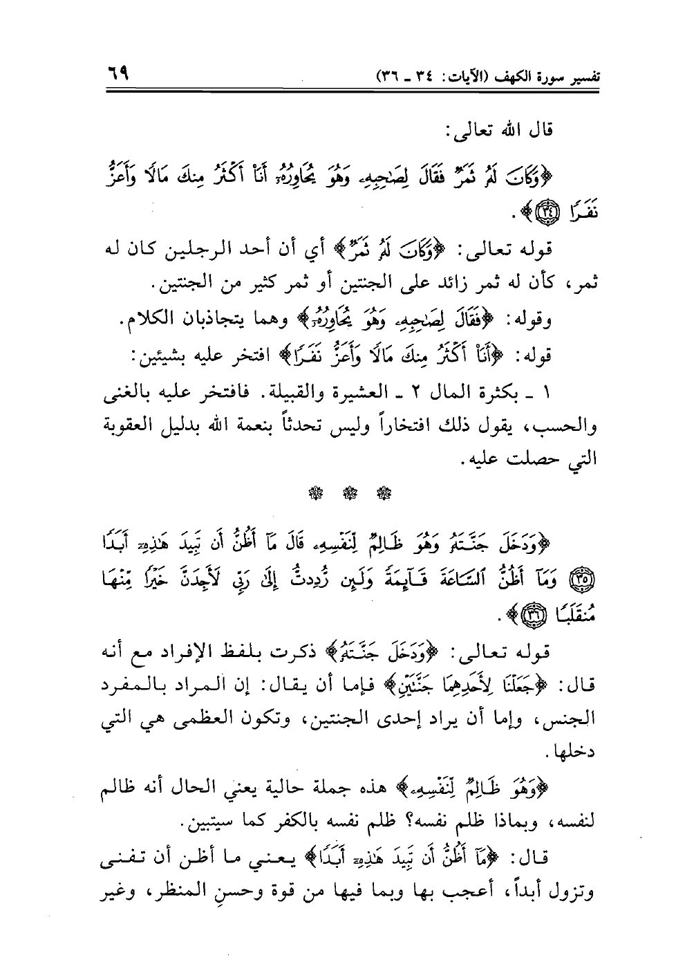 قوله تعالى: (وَدَخَلَ جَنَّتَهُ) ذكرت بلفظ الإفراد مع أنه قال: (جَعَلْنَا لِأَحَدِهِمَا جَنَّتَيْنِ) فإما أن يقال: إن المراد بالمفرد الجنس، وإما أن يراد إحدى الجنتين، وتكون العظمى هي التي دخلها.
