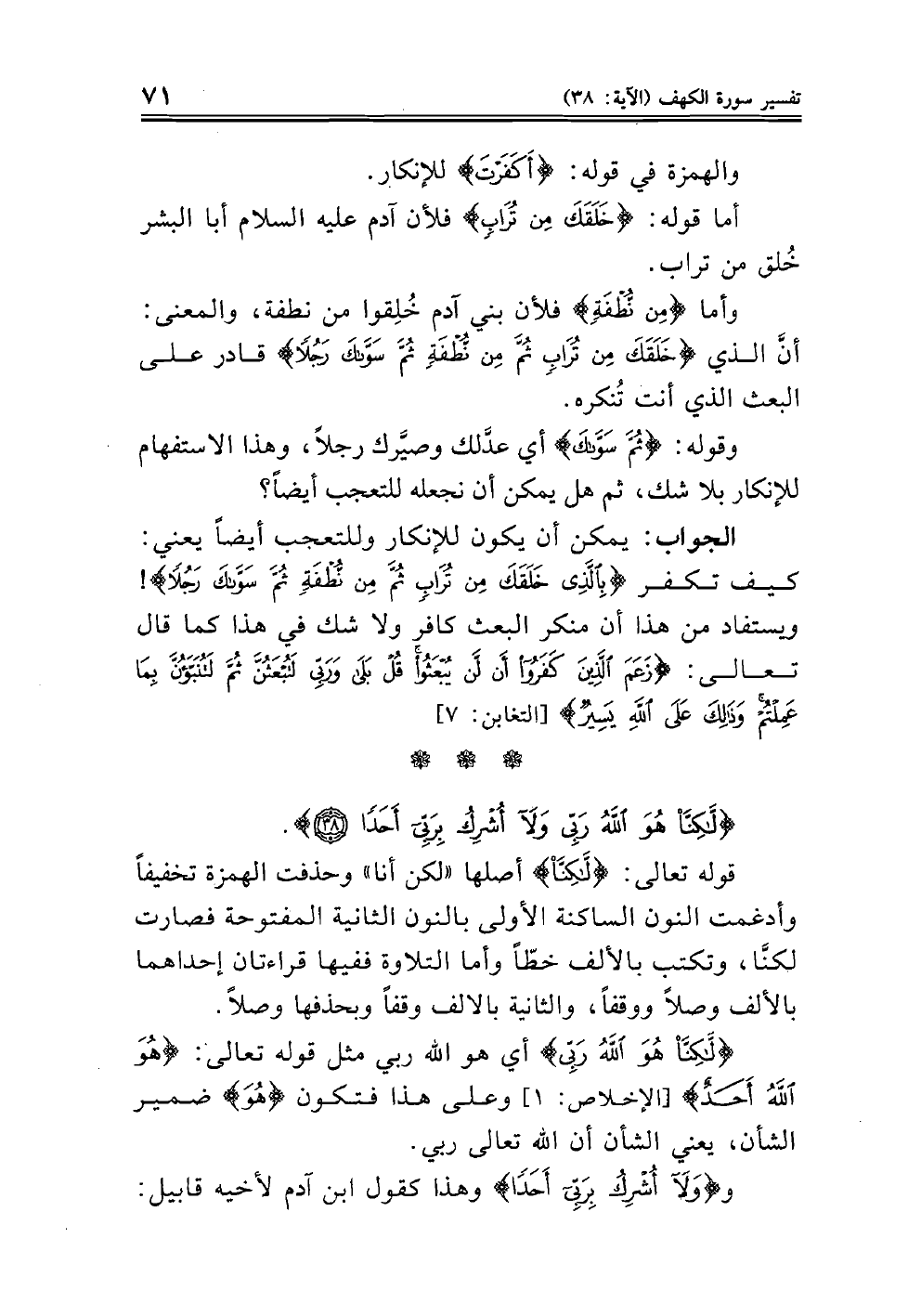 الجواب: يمكن أن يكون للإنكار وللتعجب أيضاً يعني: كيف تكفر (بِالَّذِي خَلَقَكَ مِنْ تُرَابٍ ثُمَّ مِنْ نُطْفَةٍ ثُمَّ سَوَّاكَ رَجُلاً)! ويستفاد من هذا أن منكر البعث كافر ولا شك في هذا كما قال تعالى: (زَعَمَ الَّذِينَ كَفَرُوا أَنْ لَنْ يُبْعَثُوا قُلْ بَلَى وَرَبِّي لَتُبْعَثُنَّ ثُمَّ لَتُنَبَّؤُنَّ بِمَا عَمِلْتُمْ وَذَلِكَ عَلَى اللَّهِ يَسِيرٌ) (التغابن: ٧)