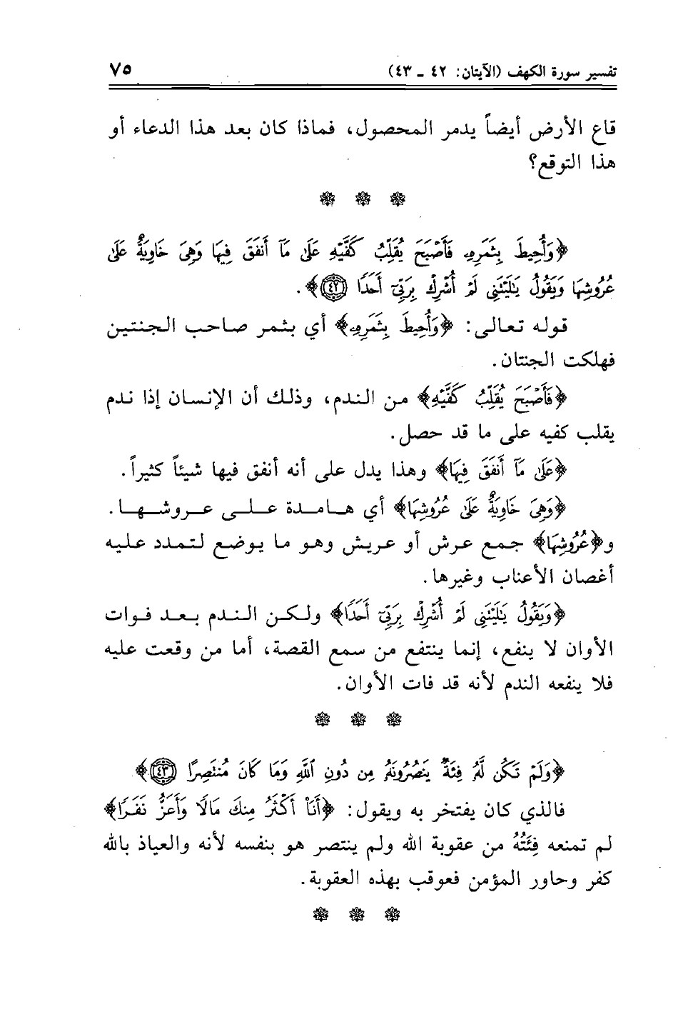 (وَيَقُولُ يَا لَيْتَنِي لَمْ أُشْرِكْ بِرَبِّي أَحَداً) ولكن الندم بعد فوات الأوان لا ينفع، إنما ينتفع من سمع القصة، أما من وقعت عليه فلا ينفعه الندم لأنه قد فات الأوان.