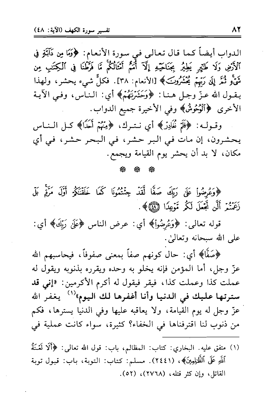 (صَفّاً) أي: حال كونهم صفاً بمعنى صفوفاً، فيحاسبهم الله، أما المؤمن فإنه يخلو به وحده ويقرره بذنوبه ويقول له عملت كذا وعملت كذا، فيقر فيقول له أكرم الأكرمين: "إني قد سترتها عليك في الدنيا وأنا أغفرها لك اليوم" (¬١) يغفر الله عز وجل له يوم القيامة، ولا يعاقبه عليها وفي الدنيا يسترها، فكم من ذنوب لنا اقترفناها في الخفاء؟ كثيرة، سواء كانت عملية في