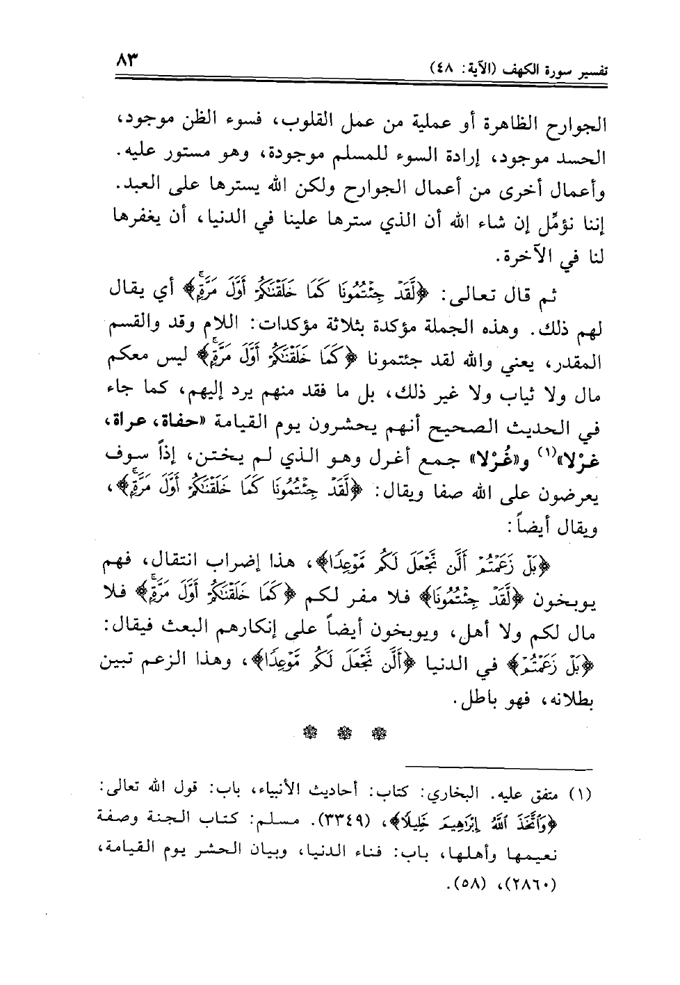 ثم قال تعالى: (لَقَدْ جِئْتُمُونَا كَمَا خَلَقْنَاكُمْ أَوَّلَ مَرَّةٍ) أي يقال لهم ذلك. وهذه الجملة مؤكدة بثلاثة مؤكدات: اللام وقد والقسم المقدر، يعني والله لقد جئتمونا (كما خلناقكم أول مرة) ليس معكم مال ولا ثياب ولا غير ذلك، بل ما فقد منهم يرد إليهم، كما جاء في الحديث الصحيح أنهم يحشرون يوم القيامة "حفاة، عراة، غرْلا" (¬١) و "غُرْلا" جمع أغرل وهو الذي لم يختن، إذاً سوف يعرضون على الله صفا ويقال: (لَقَدْ جِئْتُمُونَا كَمَا خَلَقْنَاكُمْ أَوَّلَ مَرَّةٍ)، ويقال أيضاً: