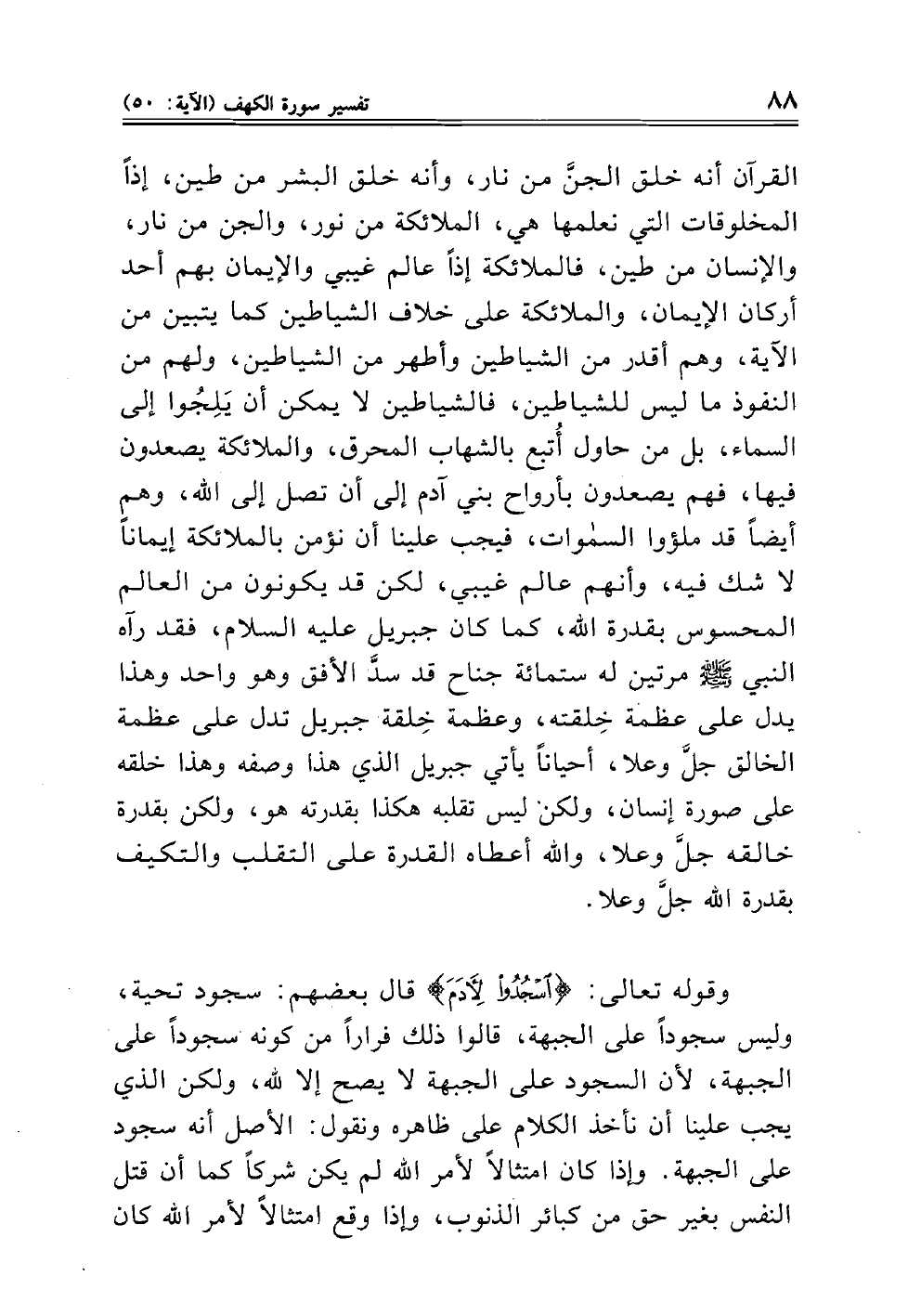 القرآن أنه خلق الجنَّ من نار، وأنه خلق البشر من طين، إذاً المخلوقات التي نعلمها هي، الملائكة من نور، والجن من نار، والإنسان من طين، فالملائكة إذاً عالم غيبي والإيمان بهم أحد أركان الإيمان، والملائكة على خلاف الشياطين كما يتبين من الآية، وهم أقدر من الشياطين وأطهر من الشياطين، ولهم من النفوذ ما ليس للشياطين، فالشياطين لا يمكن أن يَلِجُوا إلى السماء، بل من حاول أُتبع بالشهاب المحرق، والملائكة يصعدون فيها، فهم يصعدون بأرواح بني آدم إلى أن تصل إلى الله، وهم أيضاً قد ملؤوا السموات، فيجب علينا أن نؤمن بالملائكة إيماناً لا شك فيه، وأنهم عالم غيبي، لكن قد يكونون من العالم المحسوس بقدرة الله، كما كان جبريل، فقد رآه النبي صلى الله عليه وسلم مرتين له ستمائة جناح قد سدَّ الأفق وهو واحد وهذا يدل على عظمة خِلقته، وعظمة خِلقة جبريل تدل على عظمة الخالق جلَّ وعلا، أحياناً يأتي جبريل الذي هذا وصفه وهذا خلقه على صورة إنسان، ولكن ليس تقلبه هكذا بقدرته هو، ولكن بقدرة خالقه جلَّ وعلا، والله أعطاه القدرة على التقلب والتكيف بقدرة الله جلَّ وعلا.