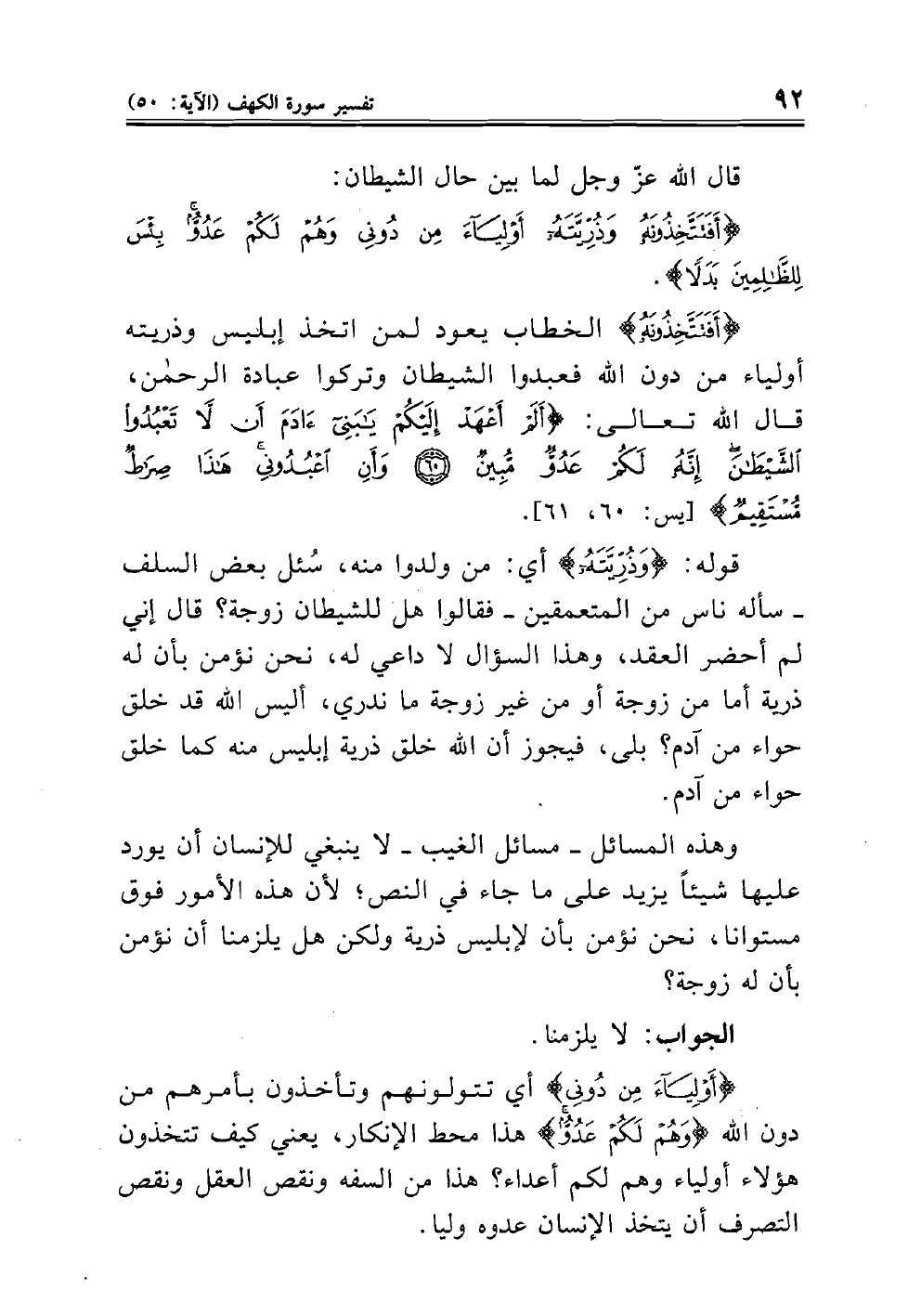 وهذه المسائل - مسائل الغيب - لا ينبغي للإنسان أن يورد عليها شيئاً يزيد على ما جاء في النص؛ لأن هذه الأمور فوق مستوانا، نحن نؤمن بأن لإبليس ذرية ولكن هل يلزمنا أن نؤمن بأن له زوجة؟