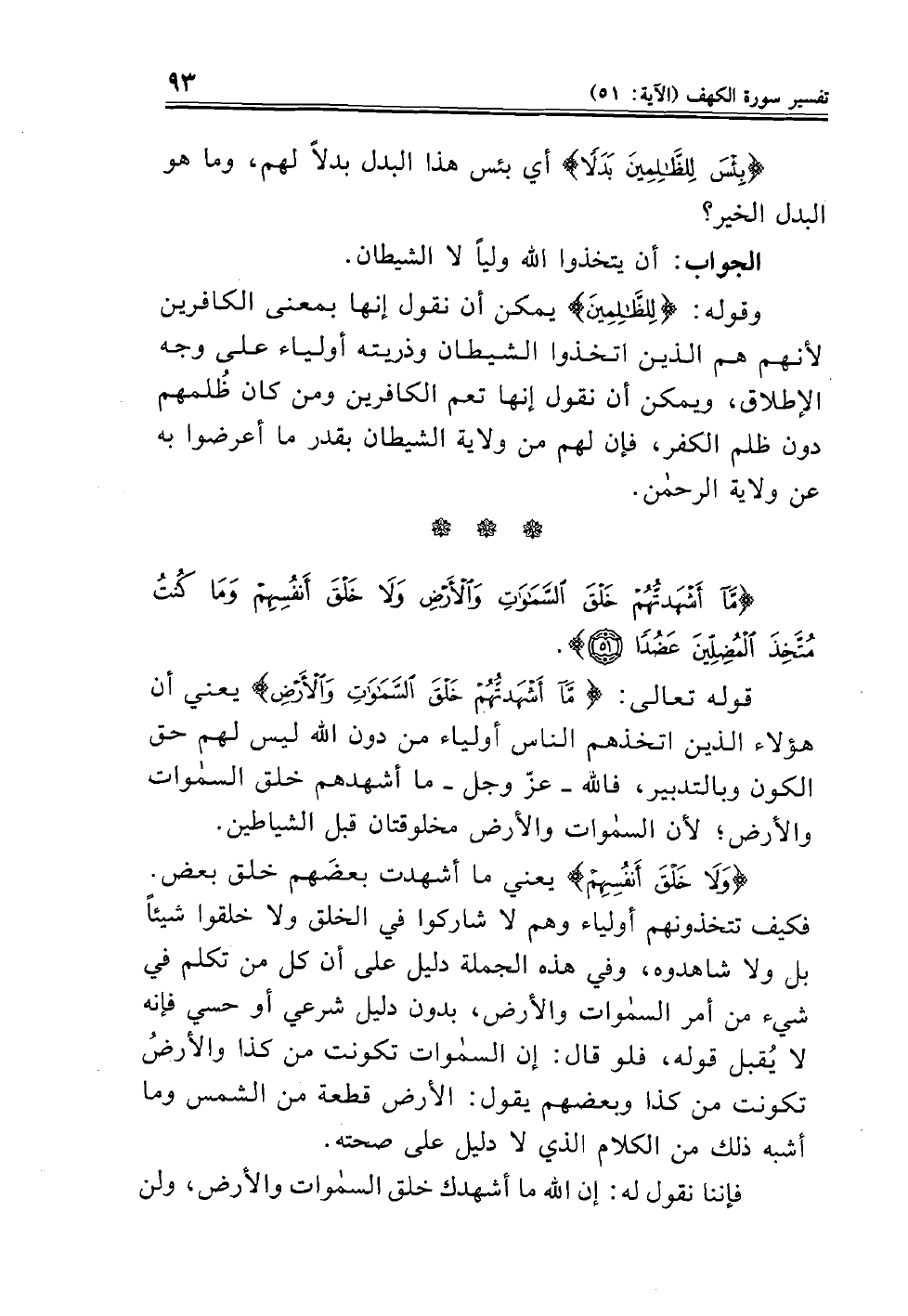 (وَلا خَلْقَ أَنْفُسِهِمْ) يعني ما أشهدت بعضَهم خلق بعض. فكيف تتخذونهم أولياء وهم لا شاركوا في الخلق ولا خلقوا شيئاً بل ولا شاهدوه، وفي هذه الجملة دليل على أن كل من تكلم في شيء من أمر السموات والأرض، بدون دليل شرعي أو حسي فإنه لا يُقبل قوله، فلو قال: إن السموات تكونت من كذا والأرضُ تكونت من كذا وبعضهم يقول: الأرض قطعة من الشمس وما أشبه ذلك من الكلام الذي لا دليل على صحته.