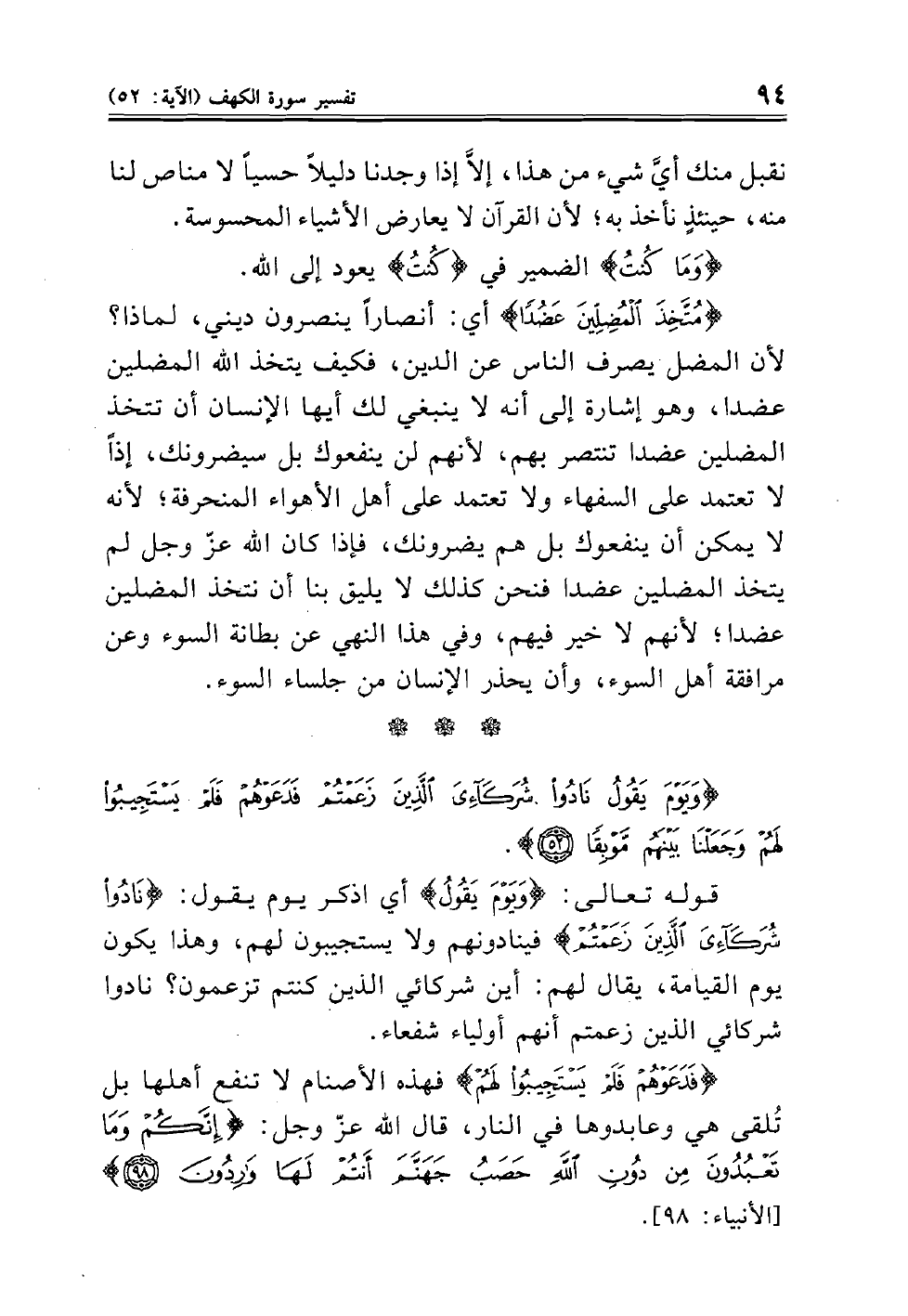 (كُنْتُ مُتَّخِذَ الْمُضِلِّينَ عَضُداً) أي: أنصاراً ينصرون ديني، لماذا؟ لأن المضل يصرف الناس عن الدين، فكيف يتخذ الله المضلين عضدا، وهو إشارة إلى أنه لا ينبغي لك أيها الإنسان أن تتخذ المضلين عضدا تنتصر بهم، لأنهم لن ينفعوك بل سيضرونك، إذاً لا تعتمد على السفهاء ولا تعتمد على أهل الأهواء المنحرفة؛ لأنه لا يمكن أن ينفعوك بل هم يضرونك، فإذا كان الله لم يتخذ المضلين عضدا فنحن كذلك لا يليق بنا أن نتخذ المضلين عضدا؛ لأنهم لا خير فيهم، وفي هذا النهي عن بطانة السوء وعن مرافقة أهل السوء، وأن يحذر الإنسان من جلساء السوء.