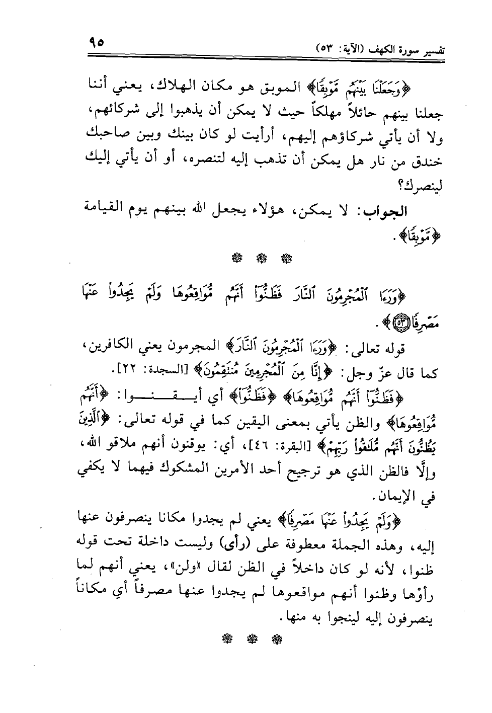 قوله تعالى: (وَرَأى الْمُجْرِمُونَ النَّارَ) المجرمون يعني الكافرين، كما قال عز وجل: (إنا من المجرمين منتقمون) (السجدة: ٢٢. (فَظَنُّوا أَنَّهُمْ مُوَاقِعُوهَا) (فظنوا) أي أيقنوا: (مُوَاقِعُوهَا) والظن يأتي بمعنى اليقين كما في قوله تعالى: (الذين يظنون أنهم ملتقوا ربهم) (البقرة: ٤٦)، أي: يوقنون أنهم ملاقو الله، وإلَاّ فالظن الذي هو ترجيح أحد الأمرين المشكوك فيهما لا يكفي في الإيمان.