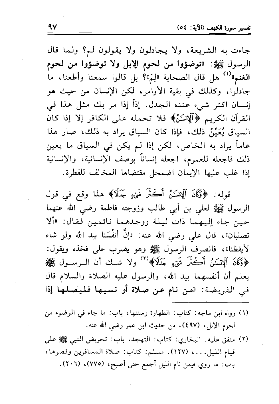 جاءت به الشريعة، ولا يجادلون ولا يقولون لم؟ ولما قال الرسول صلى الله عليه وسلم: "توضؤوا من لحوم الإبل ولا توضؤوا من لحوم الغنم" (¬١) هل قال الصحابة "لِمَ"؟ بل قالوا سمعنا وأطعنا، ما جادلوا، وكذلك في بقية الأوامر، لكن الإنسان من حيث هو إنسان أكثر شيء عنده الجدل. إذاً إذا مر بك مثل هذا في القرآن الكريم (الْأِنْسَانُ) فلا تحمله على الكافر إلا إذا كان السياق يُعَيِّنُ ذلك، فإذا كان السياق يراد به ذلك، صار هذا عاماً يراد به الخاص، لكن إذا لم يكن في السياق ما يعين ذلك فاجعله للعموم، اجعله إنساناً بوصف الإنسانية، والإنسانية إذا غلب عليها الإيمان اضمحل مقتضاها المخالف للفطرة.