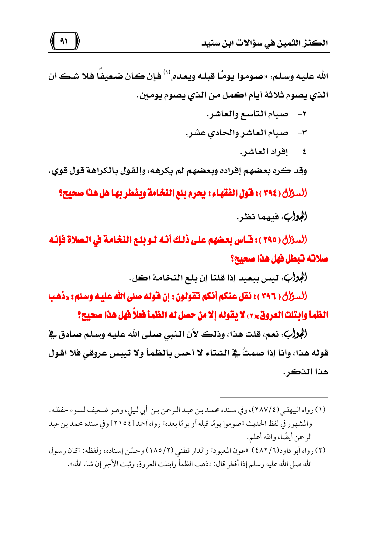 (¬1) رواه البيهقي (4/ 287)، وفي سنده محمد بن عبد الرحمن بن أبي ليلي، وهو ضعيف لسوء حفظه. والمشهور في لفظ الحديث «صوموا يومًا قبله أو يومًا بعده» رواه أحمد [2154] وفي سنده محمد بن عبد الرحمن أيضًا، والله أعلم.