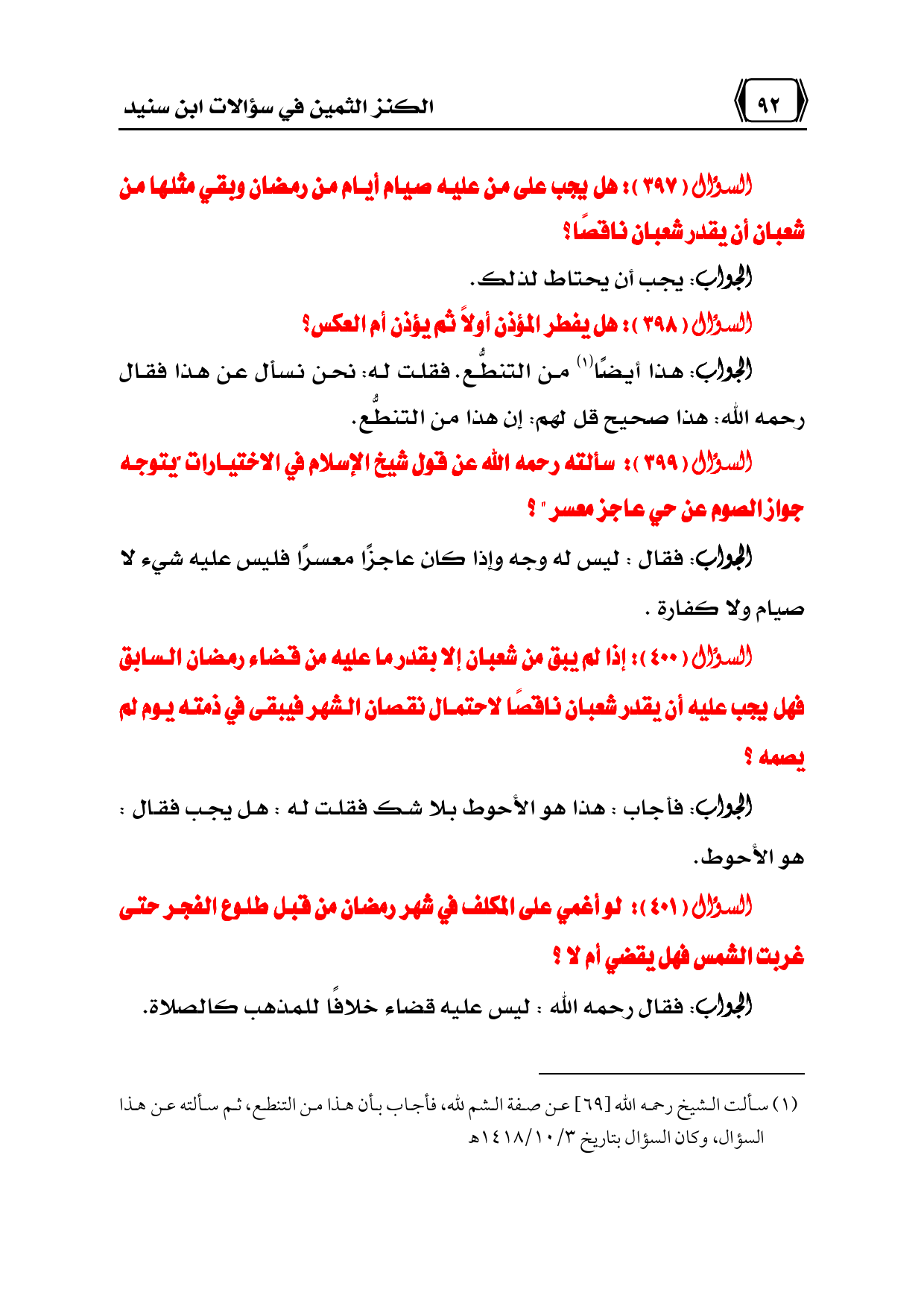 الجواب: هذا أيضًا (¬1) من التنطُّع. فقلت له: نحن نسأل عن هذا فقال رحمه الله: هذا صحيح قل لهم: إن هذا من التنطُّع.