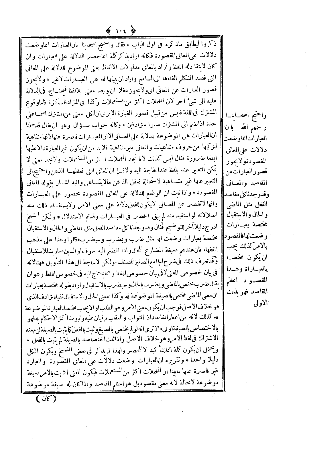 ـــــــــــــــــــــــــــــQذَكَرُوا لِيُطَابِقَ مَا ذَكَرَهُ فِي أَوَّلِ الْبَابِ، فَقَالَ وَاحْتَجَّ أَصْحَابُنَا بِأَنَّ الْعِبَارَاتِ إنَّمَا وُضِعَتْ دَلَالَاتٍ عَلَى الْمَعَانِي الْمَقْصُودَةِ فَكَأَنَّهُ أَرَادَ بِذِكْرِ كَلِمَةِ إنَّمَا حَصْرَ الدَّلَالَةِ عَلَى الْعِبَارَاتِ؛ وَإِنْ كَانَ لَا يَنْقَادُ لَهُ اللَّفْظُ وَأَرَادَ بِالْمَعَانِي مَدْلُولَاتِ الْأَلْفَاظِ يَعْنِي الْمَوْضُوعَ لِلدَّلَالَةِ عَلَى الْمَعَانِي الَّتِي قَصَدَ الْمُتَكَلِّمُ إلْقَاءَهَا إلَى السَّامِعِ، وَأَرَادَ أَنْ يُبَيِّنَهَا لَهُ هِيَ الْعِبَارَاتُ لَا غَيْرُ، وَلَا يَجُوزُ قُصُورُ الْعِبَارَاتِ عَنْ الْمَعَانِي أَيْ وَلَا يَجُوزُ عَقْلًا أَنْ يُوجَدَ مَعْنًى بِلَا لَفْظٍ فَيَحْتَاجُ فِي الدَّلَالَةِ عَلَيْهِ إلَى شَيْءٍ آخَرَ؛ لِأَنَّ الْمُهْمَلَاتِ أَكْثَرُ مِنْ الْمُسْتَعْمَلَاتِ وَكَذَا فِي الْمُتَرَادِفَاتِ كَثْرَةٌ فَأَمَّا وُقُوعُ الْمُشْتَرَكِ فِي اللُّغَةِ فَلَيْسَ مِنْ قَبِيلِ قُصُورِ الْعِبَارَةِ أَلَا يَرَى أَنَّ لِكُلِّ مَعْنًى مِنْ الْمُشْتَرَكِ اسْمًا عَلَى حِدَةٍ إذَا ضُمَّ إلَى الْمُشْتَرَكِ صَارَا مُتَرَادِفَيْنِ.