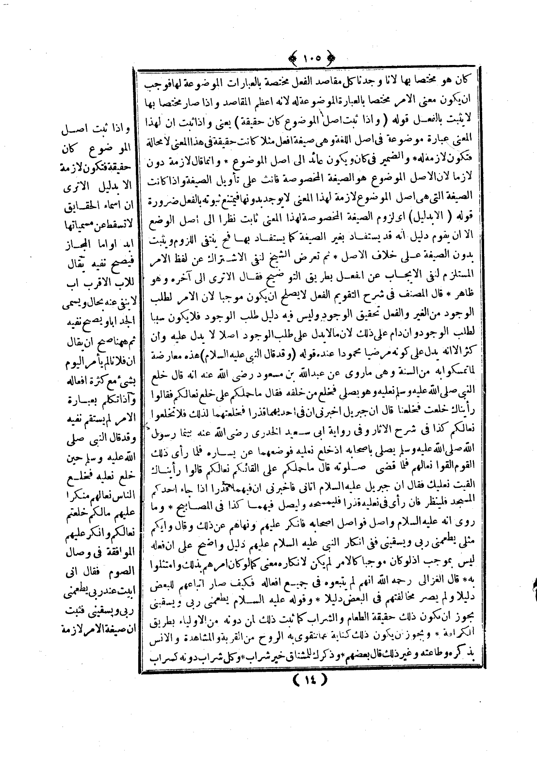 وَإِنَّمَا قَالَ لَازِمَةٌ دُونَ لَازِمًا؛ لِأَنَّ الْأَصْلَ الْمَوْضُوعَ هُوَ الصِّيغَةُ الْمَخْصُوصَةُ فَأَنَّثَ عَلَى تَأْوِيلِ الصِّيغَةِ وَإِذَا كَانَتْ الصِّيغَةُ الَّتِي هِيَ أَصْلُ الْمَوْضُوعِ لَازِمَةً لِهَذَا الْمَعْنَى لَا يُوجَدُ بِدُونِهَا فَيُمْتَنَعُ ثُبُوتُهُ بِالْفِعْلِ ضَرُورَةً قَوْلُهُ (إلَّا بِدَلِيلٍ) أَيْ لُزُومُ الصِّيغَةِ الْمَخْصُوصَةِ لِهَذَا الْمَعْنَى ثَابِتٌ نَظَرًا إلَى أَصْلِ الْوَضْعِ إلَّا أَنْ يَقُومَ دَلِيلٌ أَنَّهُ قَدْ يُسْتَفَادُ بِغَيْرِ الصِّيغَةِ كَمَا يُسْتَفَادُ بِهَا فَحِينَئِذٍ يَنْتَفِيَ اللُّزُومُ وَيَثْبُتَ بِدُونِ الصِّيغَةِ عَلَى خِلَافِ الْأَصْلِ، ثُمَّ تَعَرَّضَ الشَّيْخُ لِنَفْيِ الِاشْتِرَاكِ عَنْ لَفْظِ الْأَمْرِ الْمُسْتَلْزِمِ لِنَفْيِ الْإِيجَابِ عَنْ الْفِعْلِ بِطَرِيقِ التَّوْضِيحِ فَقَالَ أَلَا تَرَى إلَى آخِرِهِ وَهُوَ ظَاهِرٌ، قَالَ الْمُصَنِّفُ فِي شَرْحِ التَّقْوِيمِ: الْفِعْلُ لَا يَصْلُحُ أَنْ يَكُونَ مُوجِبًا؛ لِأَنَّ الْأَمْرَ لِطَلَبِ الْوُجُودِ مِنْ الْغَيْرِ وَالْفِعْلُ تَحْقِيقُ الْوُجُودِ وَلَيْسَ فِيهِ دَلِيلُ طَلَبِ الْوُجُودِ فَلَا يَكُونُ سَبَبًا لِطَلَبِ الْوُجُودِ؛ وَإِنْ دَامَ عَلَى ذَلِكَ؛ لِأَنَّ مَا لَا يَدُلُّ عَلَى طَلَبِ الْوُجُودِ أَصْلًا لَا يَدُلُّ عَلَيْهِ؛ وَإِنْ كَثُرَ إلَّا أَنَّهُ يَدُلُّ عَلَى كَوْنِهِ مُرْضِيًّا مَحْمُودًا عِنْدَهُ قَوْلُهُ (وَقَدْ قَالَ النَّبِيُّ - عَلَيْهِ السَّلَامُ -) هَذِهِ مُعَارَضَةٌ لِمَا تَمَسَّكُوا بِهِ مِنْ السُّنَّةِ، وَهِيَ مَا رُوِيَ عَنْ عَبْدِ اللَّهِ بْنِ مَسْعُودٍ - رَضِيَ اللَّهُ عَنْهُ - أَنَّهُ قَالَ «خَلَعَ النَّبِيُّ - صَلَّى اللَّهُ عَلَيْهِ وَسَلَّمَ - نَعْلَيْهِ وَهُوَ يُصَلِّي فَخَلَعَ مَنْ خَلْفَهُ فَقَالَ مَا حَمَلَكُمْ عَلَى خَلْعِ نِعَالِكُمْ فَقَالُوا رَأَيْنَاك خَلَعْت فَخَلَعْنَا قَالَ إنَّ جِبْرِيلَ أَخْبَرَنِي أَنَّ فِي أَحَدَيْهِمَا قَذَرًا فَخَلَعْتُهُمَا لِذَلِكَ فَلَا تَخْلَعُوا نِعَالَكُمْ» كَذَا فِي شَرْحِ الْآثَارِ وَفِي رِوَايَةِ أَبِي سَعِيدٍ الْخُدْرِيِّ - رَضِيَ اللَّهُ عَنْهُ - «بَيْنَمَا رَسُولُ اللَّهِ - رَضِيَ اللَّهُ عَنْهُ - يُصَلِّي بِأَصْحَابِهِ إذْ خَلَعَ نَعْلَيْهِ فَوَضَعَهُمَا عَنْ يَسَارِهِ فَلَمَّا رَأَى ذَلِكَ الْقَوْمُ أَلْقَوْا نِعَالَهُمْ فَلَمَّا قَضَى صَلَاتَهُ قَالَ مَا حَمَلَكُمْ عَلَى إلْقَائِكُمْ نِعَالَكُمْ قَالُوا رَأَيْنَاك أَلْقَيْت نَعْلَيْك فَقَالَ إنَّ جِبْرِيلَ - عَلَيْهِ السَّلَامُ - أَتَانِي فَأَخْبَرَنِي أَنَّ فِيهِمَا قَذَرًا إذَا جَاءَ أَحَدُكُمْ الْمَسْجِدَ فَلْيَنْظُرْ فَإِنْ رَأَى فِي نَعْلَيْهِ قَذَرًا فَلْيَمْسَحْهُ وَلِيُصَلِّ فِيهِمَا» كَذَا فِي الْمَصَابِيحِ.
