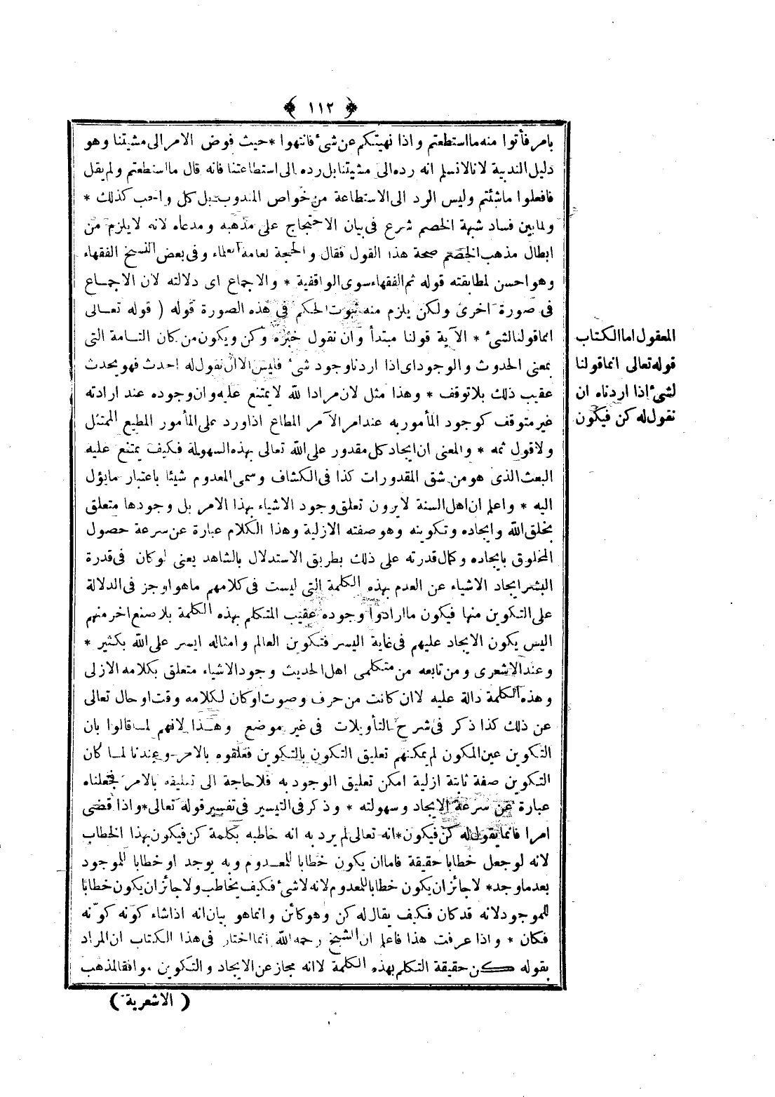 الْمَعْقُولُ أَمَّا الْكِتَابُ قَوْله تَعَالَى {إِنَّمَا قَوْلُنَا لِشَيْءٍ إِذَا أَرَدْنَاهُ أَنْ نَقُولَ لَهُ كُنْ فَيَكُونُ} [النحل: 40]