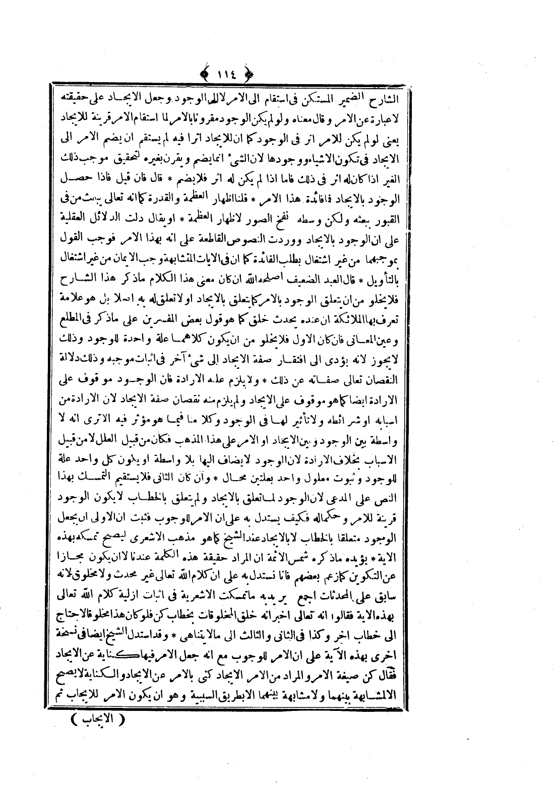 ، أَوْ يُقَالُ دَلَّتْ الدَّلَائِلُ الْعَقْلِيَّةُ عَلَى أَنَّ الْوُجُودَ بِالْإِيجَادِ وَوَرَدَتْ النُّصُوصُ الْقَاطِعَةُ عَلَى أَنَّهُ بِهَذَا الْأَمْرِ فَوَجَبَ الْقَوْلُ بِمُوجِبِهِمَا مِنْ غَيْرِ اشْتِغَالٍ بِطَلَبِ الْفَائِدَةِ كَمَا أَنَّ فِي الْآيَاتِ الْمُتَشَابِهَةِ وَجَبَ الْإِيمَانُ مِنْ غَيْرِ اشْتِغَالٍ بِالتَّأْوِيلِ، قَالَ الْعَبْدُ الضَّعِيفُ أَصْلَحَهُ اللَّهُ إنْ كَانَ مَعْنَى هَذَا الْكَلَامِ مَا ذَكَرَ هَذَا الشَّارِحُ فَلَا يَخْلُو مِنْ أَنْ يَتَعَلَّقَ الْوُجُودُ بِالْآمِرِ كَمَا يَتَعَلَّقُ بِالْإِيجَادِ أَوْ لَا تَعَلُّقَ لَهُ بِهِ أَصْلًا بَلْ هُوَ عَلَامَةٌ تَعْرِفُ بِهَا الْمَلَائِكَةُ أَنَّ عِنْدَهُ يَحْدُثُ خَلْقٌ كَمَا هُوَ قَوْلُ بَعْضِ الْمُفَسِّرِينَ عَلَى مَا ذُكِرَ فِي الْمَطْلَعِ وَعَيْنِ الْمَعَانِي؛ فَإِنْ كَانَ الْأَوَّلُ فَلَا يَخْلُو مِنْ أَنْ يَكُونَ كِلَاهُمَا عِلَّةً وَاحِدَةً لِلْوُجُودِ، وَذَلِكَ لَا يَجُوزُ؛ لِأَنَّهُ يُؤَدِّي إلَى افْتِقَارِ صِفَةِ الْإِيجَادِ إلَى شَيْءٍ آخَرَ فِي إثْبَاتِ مُوجِبِهِ وَذَلِكَ دَلَالَةُ النُّقْصَانِ تَعَالَى صِفَاتُهُ عَنْ ذَلِكَ، وَلَا يَلْزَمُ عَلَيْهِ الْإِرَادَةُ فَإِنَّ الْوُجُودَ مَوْقُوفٌ عَلَى الْإِرَادَةِ أَيْضًا كَمَا هُوَ مَوْقُوفٌ عَلَى الْإِيجَادِ وَلَمْ يَلْزَمْ مِنْهُ نُقْصَانُ صِفَةِ الْإِيجَادِ؛ لِأَنَّ الْإِرَادَةَ مِنْ أَسْبَابِهِ أَوْ شَرَائِطِهِ وَلَا تَأْثِيرَ لَهَا فِي الْوُجُودِ وَكَلَامُنَا فِيمَا هُوَ مُؤَثِّرٌ فِيهِ أَلَا تَرَى أَنَّهُ لَا وَاسِطَةَ بَيْنَ الْوُجُودِ وَبَيْنَ الْإِيجَادِ أَوْ الْأَمْرُ عَلَى هَذَا الْمَذْهَبِ فَكَانَ مِنْ قَبِيلِ الْعِلَلِ لَا مِنْ قَبِيلِ الْأَسْبَابِ بِخِلَافِ الْإِرَادَةِ؛ لِأَنَّ الْوُجُودَ لَا يُضَافُ إلَيْهَا بِلَا وَاسِطَةٍ أَوْ يَكُونُ كُلُّ وَاحِدٍ عِلَّةً لِلْوُجُودِ وَثُبُوتُ مَعْلُولٍ وَاحِدٍ بِعِلَّتَيْنِ مُحَالٌ؛ وَإِنْ كَانَ الثَّانِي فَلَا يَسْتَقِيمُ التَّمَسُّكُ بِهَذَا النَّصِّ عَلَى الْمُدَّعِي؛ لِأَنَّ الْوُجُودَ لَمَّا تَعَلَّقَ بِالْإِيجَادِ، وَلَمْ يَتَعَلَّقْ بِالْخِطَابِ لَا يَكُونُ الْوُجُودُ قَرِينَةً لِلْأَمْرِ وَحُكْمًا لَهُ فَكَيْفَ يُسْتَدَلُّ بِهِ عَلَى أَنَّ الْأَمْرَ لِلْوُجُوبِ فَثَبَتَ أَنَّ الْأَوْلَى أَنْ يُجْعَلَ الْوُجُودُ مُتَعَلِّقًا بِالْخِطَابِ لَا بِالْإِيجَادِ عِنْدَ الشَّيْخِ كَمَا هُوَ مَذْهَبُ الْأَشْعَرِيِّ لِيَصِحَّ تَمَسُّكُهُ بِهَذِهِ الْآيَةِ.