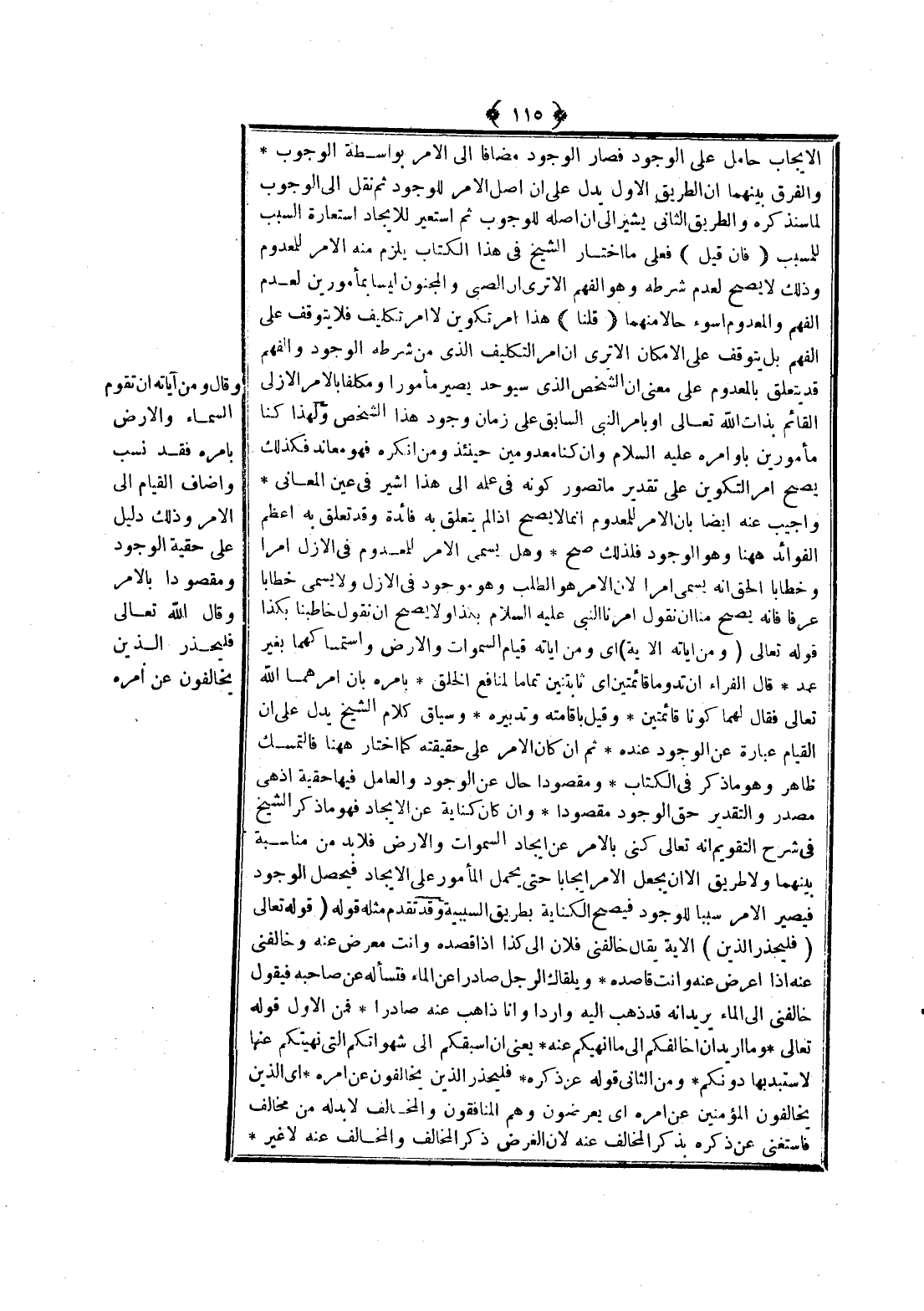 وَقَالَ {وَمِنْ آيَاتِهِ أَنْ تَقُومَ السَّمَاءُ وَالأَرْضُ بِأَمْرِهِ} [الروم: 25] فَقَدْ نَسَبَ وَأَضَافَ الْقِيَامَ إلَى الْأَمْرِ وَذَلِكَ دَلِيلٌ عَلَى حَقِّيَّةَ الْوُجُودِ مَقْصُودًا بِالْأَمْرِ وَقَالَ اللَّهُ تَعَالَى: {فَلْيَحْذَرِ الَّذِينَ يُخَالِفُونَ عَنْ أَمْرِهِ} [النور: 63]