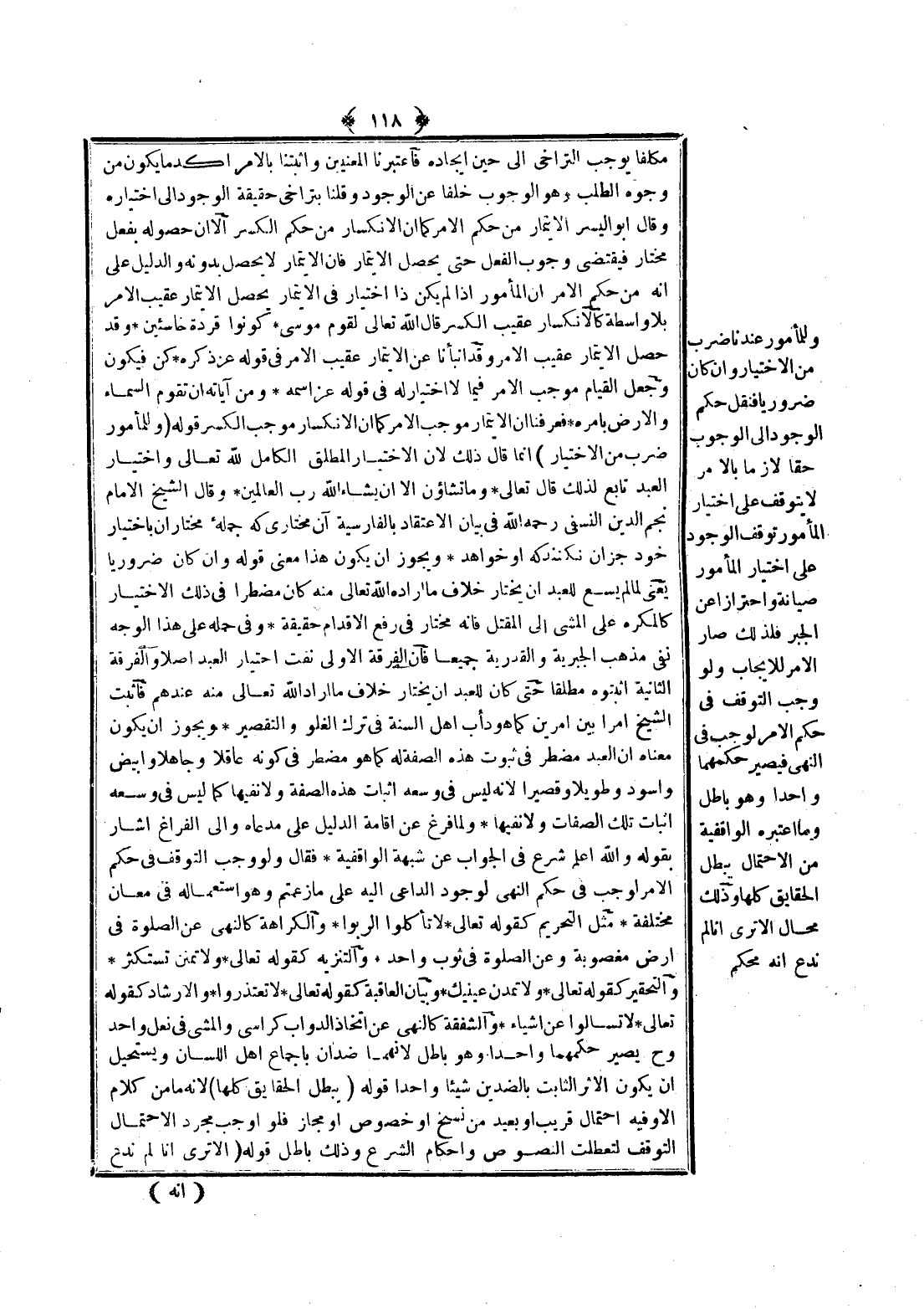 وَإِنْ كَانَ ضَرُورِيًّا يَعْنِي لَمَّا لَمْ يَسَعْ لِلْعَبْدِ أَنْ يَخْتَارَ خِلَافَ مَا أَرَادَهُ اللَّهُ تَعَالَى مِنْهُ كَانَ مُضْطَرًّا فِي ذَلِكَ الِاخْتِيَارِ كَالْمُكْرَهِ عَلَى الْمَشْيِ إلَى الْمَقْتَلِ فَإِنَّهُ مُخْتَارٌ فِي رَفْعِ الْأَقْدَامِ حَقِيقَةً، وَفِي حَمْلِهِ عَلَى هَذَا الْوَجْهِ نَفْيُ مَذْهَبِ الْجَبْرِيَّةِ وَالْقَدَرِيَّةِ جَمِيعًا فَإِنَّ الْفِرْقَةَ الْأُولَى نَفَتْ اخْتِيَارَ الْعَبْدِ أَصْلًا وَالْفِرْقَةَ الثَّانِيَةَ أَثْبَتُوهُ مُطْلَقًا حَتَّى كَانَ لِلْعَبْدِ أَنْ يَخْتَارَ خِلَافَ مَا أَرَادَ اللَّهُ تَعَالَى مِنْهُ عِنْدَهُمْ فَأَثْبَتَ الشَّيْخُ أَمْرًا بَيْنَ أَمْرَيْنِ كَمَا هُوَ دَأْبُ أَهْلِ السُّنَّةِ فِي تَرْكِ الْغُلُوِّ وَالتَّقْصِيرِ، وَيَجُوزُ أَنْ يَكُونَ مَعْنَاهُ أَنَّ الْعَبْدَ مُضْطَرٌّ فِي ثُبُوتِ هَذِهِ الصِّفَةِ لَهُ كَمَا هُوَ مُضْطَرٌّ فِي كَوْنِهِ عَاقِلًا وَجَاهِلًا وَأَبْيَضَ وَأَسْوَدَ وَطَوِيلًا وَقَصِيرًا؛ لِأَنَّهُ لَيْسَ فِي وُسْعِهِ إثْبَاتُ هَذِهِ الصِّفَةِ وَلَا نَفْيُهَا كَمَا لَيْسَ فِي وُسْعِهِ إثْبَاتُ تِلْكَ الصِّفَاتِ وَلَا نَفْيُهَا، وَلَمَّا فَرَغَ عَنْ إقَامَةِ الدَّلِيلِ عَلَى مُدَّعَاهُ وَإِلَى الْفَرَاغِ أَشَارَ بِقَوْلِهِ وَاَللَّهُ أَعْلَمُ شَرَعَ فِي الْجَوَابِ عَنْ شُبْهَةِ الْوَاقِفِيَّةِ، فَقَالَ وَلَوْ وَجَبَ التَّوَقُّفُ فِي حُكْمِ الْأَمْرِ لَوَجَبَ فِي حُكْمِ النَّهْيِ لِوُجُودِ الدَّاعِي إلَيْهِ عَلَى مَا زَعَمْتُمْ، وَهُوَ اسْتِعْمَالُهُ فِي مَعَانٍ مُخْتَلِفَةٍ، مِثْلَ التَّحْرِيمِ كَقَوْلِهِ تَعَالَى {لا تَأْكُلُوا الرِّبَا} [آل عمران: 130] وَالْكَرَاهَةُ كَالنَّهْيِ عَنْ الصَّلَاةِ فِي أَرْضٍ مَغْصُوبَةٍ وَعَنْ الصَّلَاةِ فِي ثَوْبٍ وَاحِدٍ، وَالتَّنْزِيهُ كَقَوْلِهِ تَعَالَى {وَلا تَمْنُنْ تَسْتَكْثِرُ} [المدثر: 6]