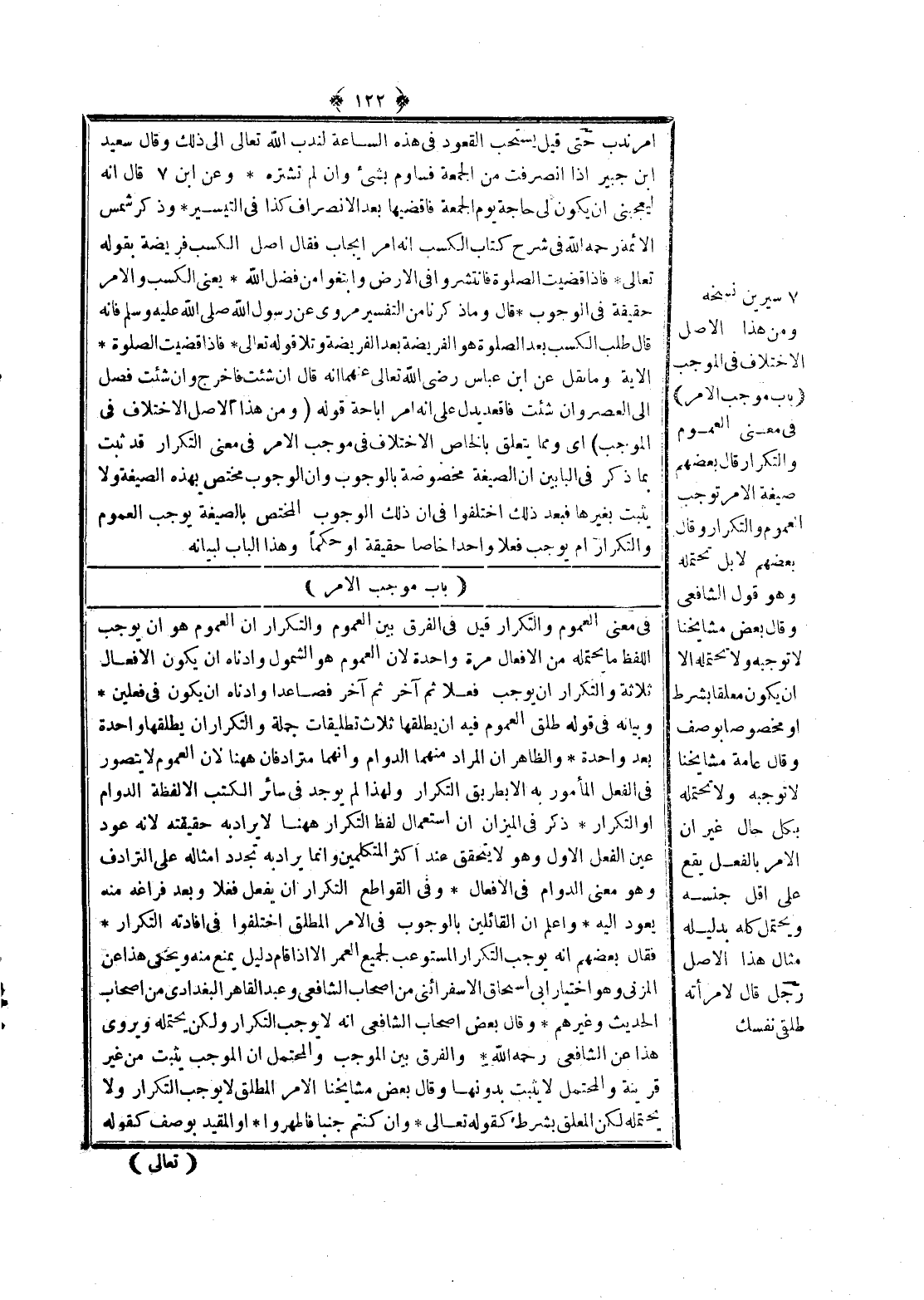 وَعَنْ ابْنِ سِيرِينَ قَالَ إنَّهُ لَيُعْجِبُنِي أَنْ يَكُونَ لِي حَاجَةٌ يَوْمَ الْجُمُعَةِ فَأَقْضِيهَا بَعْدَ الِانْصِرَافِ كَذَا فِي التَّيْسِيرِ، وَذَكَرَ شَمْسُ الْأَئِمَّةِ - رَحِمَهُ اللَّهُ - فِي شَرْحِ كِتَابِ الْكَسْبِ أَنَّهُ أَمْرُ إيجَابٍ فَقَالَ أَصْلُ الْكَسْبِ فَرِيضَةٌ بِقَوْلِهِ تَعَالَى {فَإِذَا قُضِيَتِ الصَّلاةُ فَانْتَشِرُوا فِي الأَرْضِ وَابْتَغُوا مِنْ فَضْلِ اللَّهِ} [الجمعة: 10] يَعْنِي الْكَسْبَ وَالْأَمْرُ حَقِيقَةٌ فِي الْوُجُوبِ، قَالَ وَمَا ذَكَرْنَا مِنْ التَّفْسِيرِ مَرْوِيٌّ عَنْ رَسُولِ اللَّهِ - صَلَّى اللَّهُ عَلَيْهِ وَسَلَّمَ - فَإِنَّهُ قَالَ «طَلَبُ الْكَسْبِ بَعْدَ الصَّلَاةِ هُوَ الْفَرِيضَةُ بَعْدَ الْفَرِيضَةِ وَتَلَا قَوْله تَعَالَى {فَإِذَا قُضِيَتِ الصَّلاةُ} [الجمعة: 10] » الْآيَةُ وَمَا نُقِلَ عَنْ ابْنِ عَبَّاسٍ - رَضِيَ اللَّهُ عَنْهُمَا - أَنَّهُ قَالَ إنْ شِئْت فَاخْرُجْ؛ وَإِنْ شِئْت فَصَلِّ إلَى الْعَصْرِ وَإِنْ شِئْت فَاقْعُدْ يَدُلُّ عَلَى أَنَّهُ أَمْرُ إبَاحَةٍ قَوْلُهُ (وَمِنْ هَذَا الْأَصْلِ الِاخْتِلَافُ فِي الْمُوجِبِ) أَيْ وَمِمَّا يَتَعَلَّقُ بِالْخَاصِّ الِاخْتِلَافُ فِي مُوجِبِ الْأَمْرِ فِي مَعْنَى التَّكْرَارِ قَدْ يَثْبُتُ بِمَا ذُكِرَ فِي الْبَابَيْنِ أَنَّ الصِّيغَةَ مَخْصُوصَةٌ بِالْوُجُوبِ، وَأَنَّ الْوُجُوبَ مُخْتَصٌّ بِهَذِهِ الصِّيغَةِ وَلَا يَثْبُتُ بِغَيْرِهَا فَبَعْدَ ذَلِكَ اخْتَلَفُوا فِي أَنَّ ذَلِكَ الْوُجُوبَ الْمُخْتَصَّ بِالصِّيغَةِ يُوجِبُ الْعُمُومَ وَالتَّكْرَارَ أَمْ يُوجِبُ فِعْلًا وَاحِدًا خَاصًّا حَقِيقَةً أَوْ حُكْمًا وَهَذَا الْبَابُ لِبَيَانِهِ