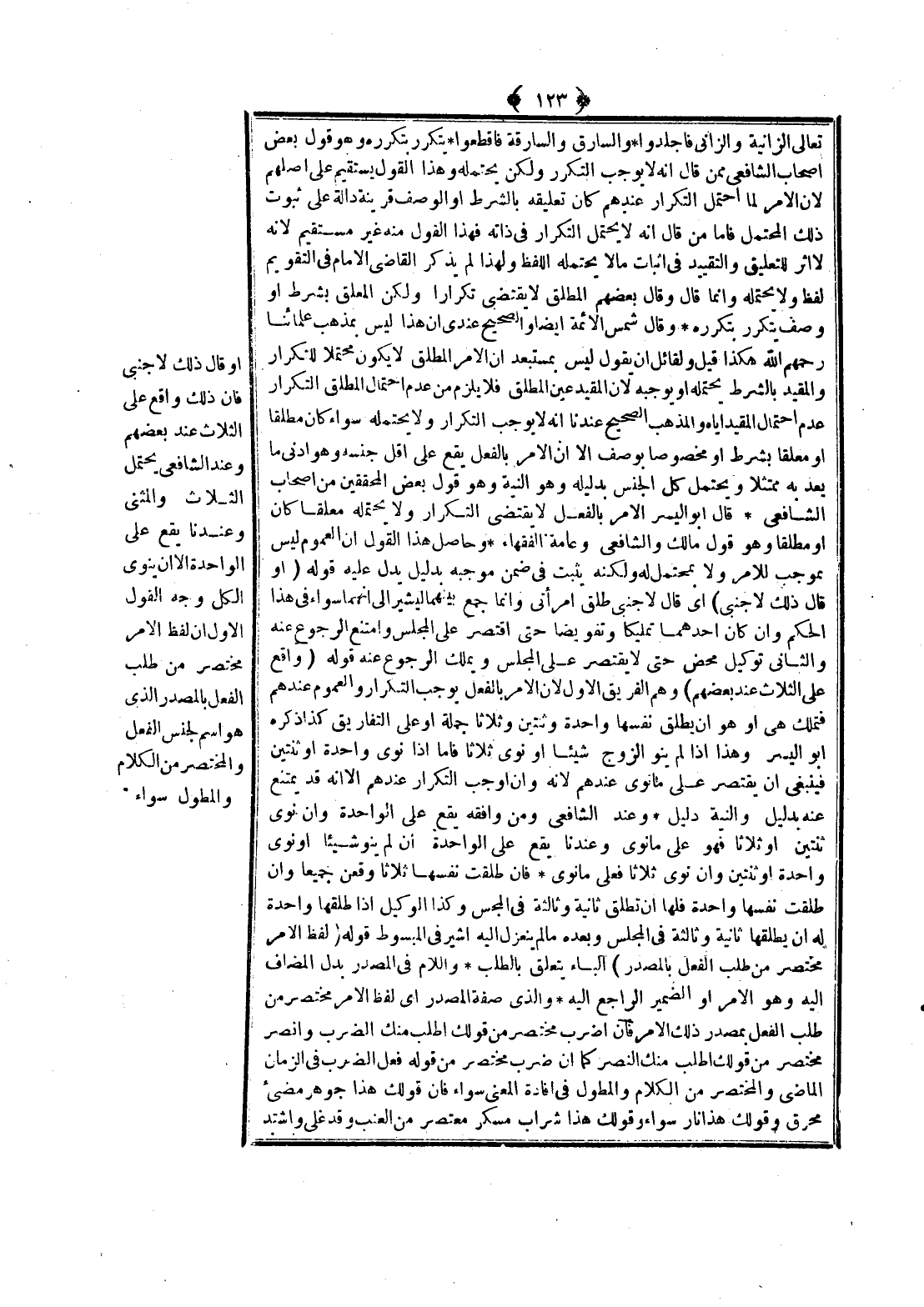 ، وَقَالَ شَمْسُ الْأَئِمَّةِ أَيْضًا وَالصَّحِيحُ عِنْدِي أَنَّ هَذَا لَيْسَ بِمَذْهَبِ عُلَمَائِنَا - رَحِمَهُمُ اللَّهُ - هَكَذَا قِيلَ وَلِقَائِلٍ أَنْ يَقُولَ لَيْسَ بِمُسْتَبْعَدٍ أَنَّ الْأَمْرَ الْمُطْلَقَ لَا يَكُونُ مُحْتَمَلًا لِلتَّكْرَارِ وَالْمُقَيَّدُ بِالشَّرْطِ يَحْتَمِلُهُ أَوْ يُوجِبُهُ؛ لِأَنَّ الْمُقَيَّدَ عَيْنُ الْمُطْلَقِ فَلَا يَلْزَمُ مِنْ عَدَمِ احْتِمَالِ الْمُطْلَقِ التَّكْرَارَ عَدَمُ احْتِمَالِ الْمُقَيَّدِ إيَّاهُ وَالْمَذْهَبُ الصَّحِيحُ عِنْدَنَا أَنَّهُ لَا يُوجِبُ التَّكْرَارَ وَلَا يَحْتَمِلُهُ سَوَاءٌ كَانَ مُطْلَقًا أَوْ مُعَلَّقًا بِشَرْطٍ أَوْ مَخْصُوصًا بِوَصْفٍ إلَّا أَنَّ الْأَمْرَ بِالْفِعْلِ يَقَعُ عَلَى أَقَلِّ جِنْسِهِ، وَهُوَ أَدْنَى مَا يُعَدُّ بِهِ مُمْتَثِلًا وَيَحْتَمِلُ كُلُّ الْجِنْسِ بِدَلِيلِهِ، وَهُوَ النِّيَّةُ، وَهُوَ قَوْلُ بَعْضِ الْمُحَقِّقِينَ مِنْ أَصْحَابِ الشَّافِعِيِّ، قَالَ أَبُو الْيُسْرِ الْأَمْرُ بِالْفِعْلِ لَا يَقْتَضِي التَّكْرَارَ وَلَا يَحْتَمِلُهُ مُعَلَّقًا كَانَ أَوْ مُطْلَقًا، وَهُوَ قَوْلُ مَالِكٍ وَالشَّافِعِيِّ وَعَامَّةِ الْفُقَهَاءِ، وَحَاصِلُ هَذَا الْقَوْلِ أَنَّ الْعُمُومَ لَيْسَ بِمُوجِبٍ لِلْأَمْرِ وَلَا بِمُحْتَمِلٍ لَهُ وَلَكِنَّهُ يَثْبُتُ فِي ضِمْنِ مُوجِبِهِ بِدَلِيلٍ يَدُلُّ عَلَيْهِ.