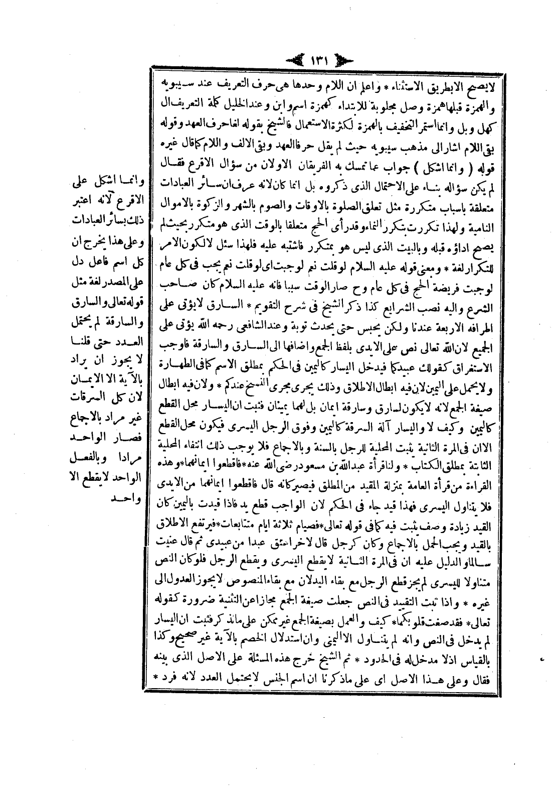 قَوْلُهُ (وَإِنَّمَا أُشْكِلَ) جَوَابٌ عَمَّا تَمَسَّكَ بِهِ الْفَرِيقَانِ الْأَوَّلَانِ مِنْ سُؤَالِ الْأَقْرَعِ فَقَالَ لَمْ يَكُنْ سُؤَالُهُ بِنَاءً عَلَى الِاحْتِمَالِ الَّذِي ذَكَرُوهُ بَلْ إنَّمَا كَانَ؛ لِأَنَّهُ عَرَفَ أَنَّ سَائِرَ الْعِبَادَاتِ مُتَعَلِّقَةٌ بِأَسْبَابٍ مُتَكَرِّرَةٍ مِثْلَ تَعَلُّقِ الصَّلَاةِ بِالْأَوْقَاتِ وَالصَّوْمِ بِالشَّهْرِ وَالزَّكَاةِ بِالْأَمْوَالِ النَّامِيَةِ وَلِهَذَا تَكَرَّرَتْ بِتَكَرُّرِ النَّمَاءِ، وَقَدْ رَأَى الْحَجَّ مُتَعَلِّقًا بِالْوَقْتِ الَّذِي هُوَ مُتَكَرِّرٌ بِحَيْثُ لَمْ يَصِحَّ أَدَاؤُهُ قَبْلَهُ وَبِالْبَيْتِ الَّذِي لَيْسَ هُوَ بِمُتَكَرِّرٍ فَاشْتَبَهَ عَلَيْهِ؛ فَلِهَذَا سُئِلَ لَا لِكَوْنِ الْأَمْرِ لِلتَّكْرَارِ لُغَةً، وَمَعْنَى قَوْلِهِ - عَلَيْهِ السَّلَامُ - «لَوْ قُلْت نَعَمْ لَوَجَبَتْ» أَيْ لَوْ قُلْت نَعَمْ يَجِبُ فِي كُلِّ عَامٍ لَوَجَبَتْ فَرِيضَةُ الْحَجِّ فِي كُلِّ عَامٍ وَحِينَئِذٍ صَارَ الْوَقْتُ سَبَبًا، فَإِنَّهُ - عَلَيْهِ السَّلَامُ - كَانَ صَاحِبَ الشَّرْعِ وَإِلَيْهِ نَصْبُ الشَّرَائِعِ كَذَا ذَكَرَ الشَّيْخُ فِي شَرْحِ التَّقْوِيمِ، السَّارِقُ لَا يُؤْتَى عَلَى أَطْرَافِهِ الْأَرْبَعَةِ عِنْدَنَا وَلَكِنْ يُحْبَسُ حَتَّى يُحْدِثَ تَوْبَةً وَعِنْدَ الشَّافِعِيِّ - رَحِمَهُ اللَّهُ - يُؤْتَى عَلَى الْجَمِيعِ؛ لِأَنَّ اللَّهَ تَعَالَى نَصَّ عَلَى الْأَيْدِي بِلَفْظِ الْجَمْعِ وَأَضَافَهَا إلَى السَّارِقِ وَالسَّارِقَةِ فَأَوْجَبَتْ الِاسْتِغْرَاقَ كَقَوْلِك عَبِيدُكُمَا فَيَدْخُلُ الْيَسَارُ كَالْيَمِينِ فِي الْحُكْمِ بِمُطْلَقِ الِاسْمِ كَمَا فِي الطَّهَارَةِ وَلَا يُحْمَلُ عَلَى الْيَمِينِ؛ لِأَنَّ فِيهِ إبْطَالَ الْإِطْلَاقِ وَذَلِكَ يَجْرِي مَجْرَى النَّسْخِ عِنْدَكُمْ؛ وَلِأَنَّ فِيهِ إبْطَالَ صِيغَةِ الْجَمْعِ؛ لِأَنَّهُ لَا يَكُونُ لِسَارِقٍ وَسَارِقَةٍ أَيْمَانٌ بَلْ لَهُمَا يَمِينَانِ فَثَبَتَ أَنَّ الْيَسَارَ مَحَلُّ الْقَطْعِ كَالْيَمِينِ وَكَيْفَ إلَّا وَالْيَسَارُ آلَةُ السَّرِقَةِ كَالْيَمِينِ وَفَوْقَ الرِّجْلِ الْيُسْرَى فَيَكُونُ مَحَلُّ الْقَطْعِ إلَّا أَنَّ فِي الْمَرَّةِ الثَّانِيَةِ يَثْبُتُ الْمَحَلِّيَّةُ لِلرَّجُلِ بِالسُّنَّةِ وَبِالْإِجْمَاعِ فَلَا يُوجِبُ ذَلِكَ انْتِفَاءَ الْمَحَلِّيَّةِ الثَّابِتَةِ بِمُطْلَقِ الْكِتَابِ.
